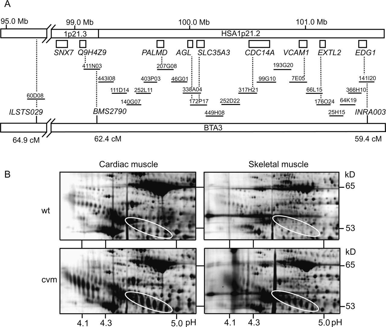 Bovine-human comparative map. (A) Twenty-two BAC clones constitute the minimum tiling path between BMS2790 and INRA003. Genes and map positions in HSA1p21 are based on the human genome draft sequence. Dotted lines indicate the gene content of the BAC clones. The positions (in cM) of microsatellite markers ILSTS029, BMS2790, and INRA003 on the bovine linkage map are indicated. (B) Differential proteome patterns of cardiac and skeletal tissues from CVM affected and unaffected (wt) calves. The four images display segments from silver-stained high-resolution 2DE maps. The encircled areas show the characteristic electrophoretic pattern of α1-antitrypsin that was observed only in tissues from affected CVM calves. The mobility changes with a shift in pI as well as in MW indicate that aberrant protein glycosylation is associated with CVM. Moreover, the increased spot intensity of α1-antitrypsin in disease-affected tissue relative to normal tissue suggests that the abnormally glycosylated variants accumulate in the tissues of affected calves. The pH spans are indicated along the x-axis and the approximate molecular weight is on the y-axis.