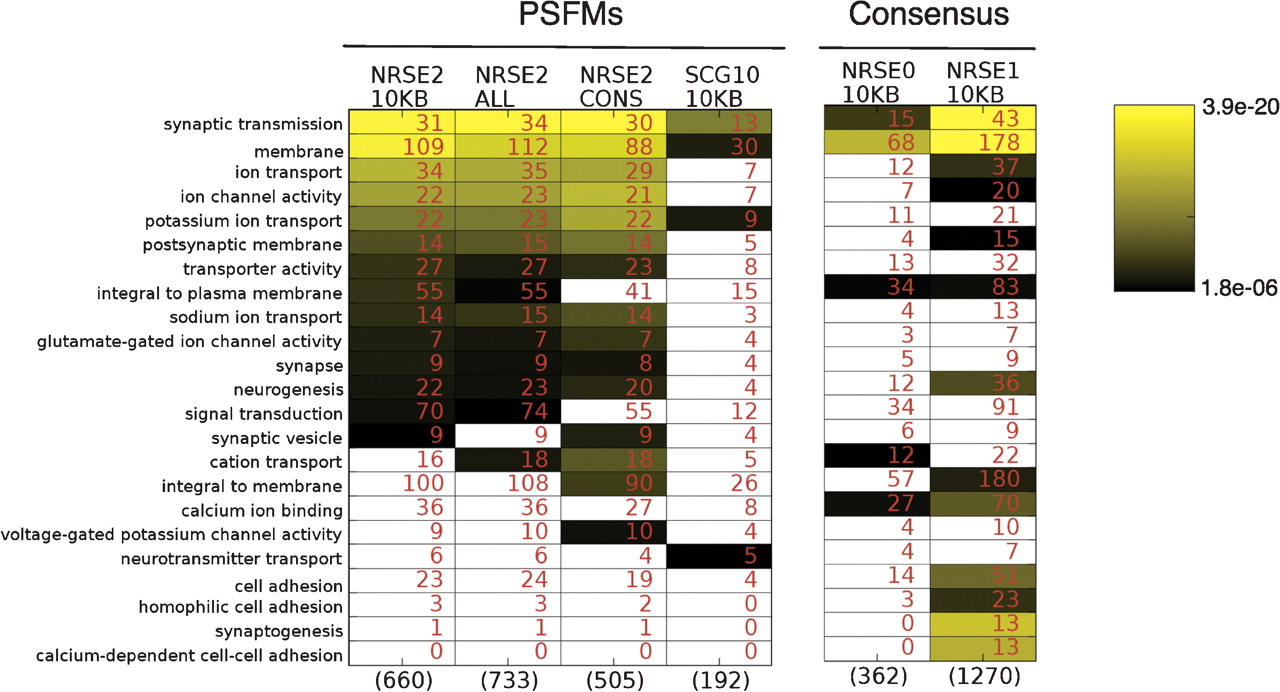 Gene Ontology enrichment comparison of different NRSE cis-regulatory cohorts. Cohorts of human genes within 10 kb of a candidate NRSE0 (Schoenherr et al. 1996), NRSE1 (Bruce et al. 2004), SCG10 (the original seed motif), NRSE2, All NRSE2 matches, and conserved NRSE2 matches were filtered of repeat matches and were analyzed for GO term overrepresentation. Significantly enriched GO terms in at least one of the cohorts (of 4576 possible GO terms) are shown. Numbers in cells represent the genes with the term in the cohort, while numbers in parentheses represent the cohort size. Cells shown in color pass the threshold of significance, as determined by a Bonferroni correction. GO terms are sorted in decreasing order by P-values of the leftmost column. Note that GO enrichments are in terms of decrease in P-values, which are directly correlated to the size of the cohorts; the number of genes in the shared association cohort with a particular GO term may go down or stay the same, while its significance increases. The NRSE1 motif behaves differently from the other definitions, as seen in the enrichment of synaptogenesis, which is the result of weak matches within the paralogous protocadherin β family.
