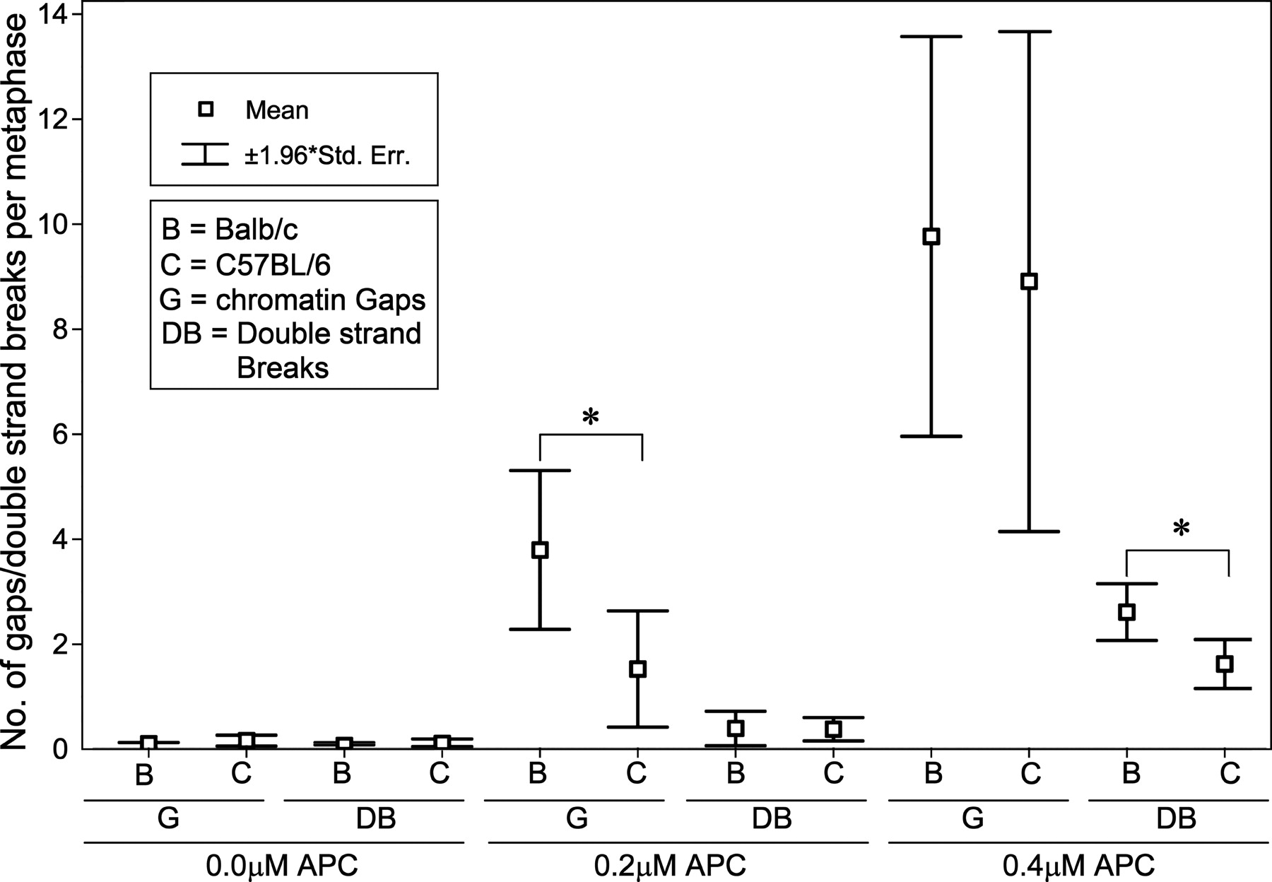 Frequencies of chromatin gaps (G) and double-strand breaks (DB) at different APC concentrations in (B) BALB/c and (C) C57BL/6 mouse splenocytes. The y-axis shows the mean numbers of G and DB per metaphase; for each strain and APC concentration, means ± standard errors were calculated from counts in 125 metaphases (five mice). Statistically significant differences (Mann- Whitney U-test, P < 0.05) between strains are indicated with asterisks (*). The numbers of induced G and DB are slightly higher in BALB/c compared to C57BL/6 cells.