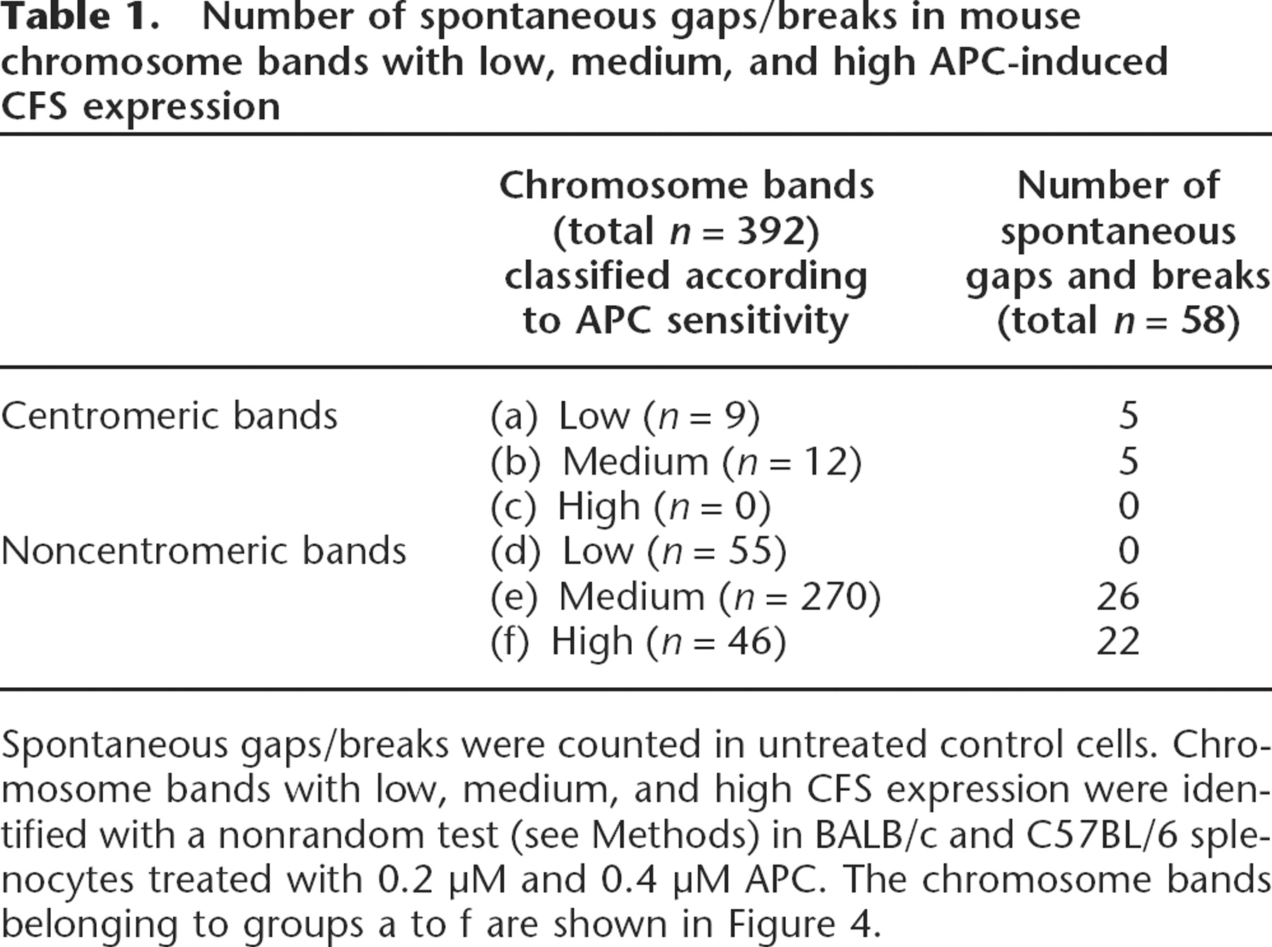 Number of spontaneous gaps/breaks in mouse chromosome bands with low, medium, and high APC-induced CFS expression