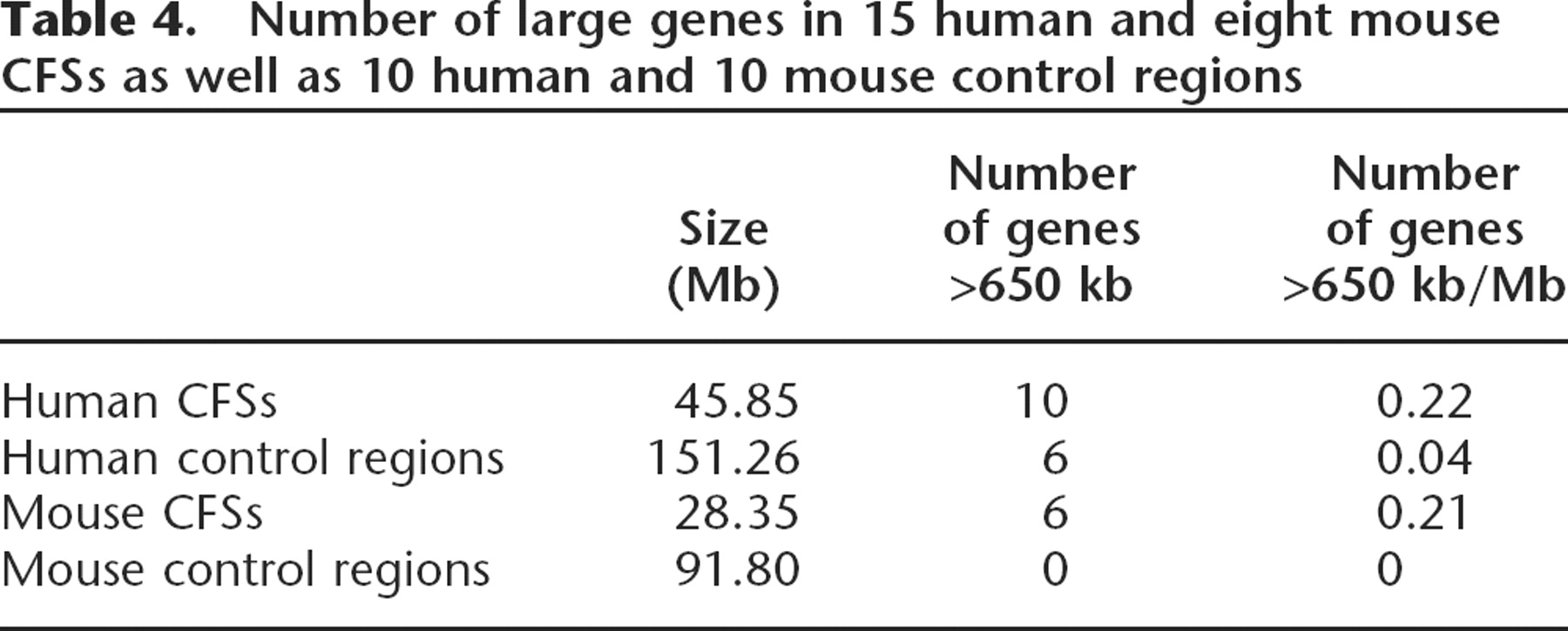 Number of large genes in 15 human and eight mouse CFSs as well as 10 human and 10 mouse control regions