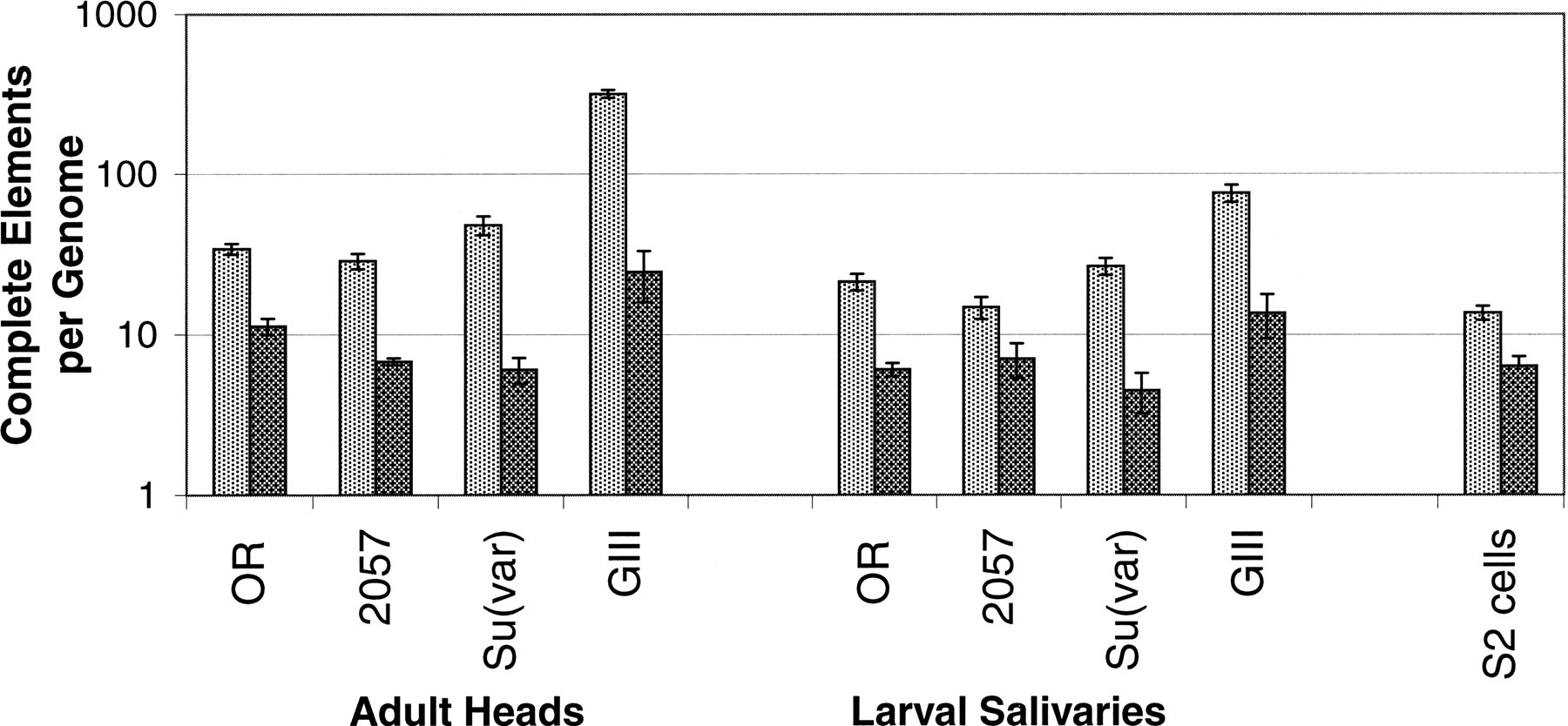 Estimated number of complete HeT-A and TART elements in D. melanogaster. Two features illustrated by this graph are the under-replication in salivary glands over a data range so wide that the vertical axis has been chosen to be logarithmic, and also the near proportionality over such a wide range in the relationship between the number of HeT-A and TART elements across different stocks and tissues (correlation coefficient, r = 0.88–0.96, P = 0.07–0.0001, depending on tissue type) (see Supplemental material, Section 3.) Less obvious, but statistically significant, is the tracking of elements in heads vs. that same element in salivary glands (r = 0.95–0.99, P = 0.05 to <0.0001). Light gray indicates HeT-A; dark gray, TART.