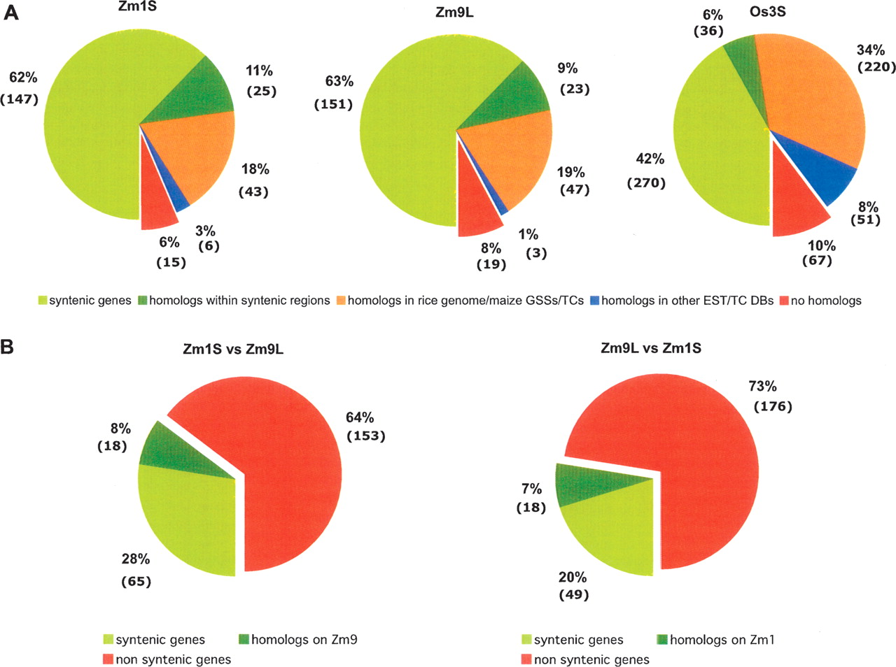 Corresponding, syntenic genes between the Zm1S, Os3S, and Zm9L chromosomal regions. Gene models for all three regions were determined as described in the text. A graphic representation is given for genes (A) that are syntenic, have homologs within the syntenic regions, have homologs in the rice genome or maize GSSs/EST collections, have a homologous counterpart in other plant EST collections, or are species-specific; and (B) that are syntenic between both maize regions and have a homolog or no homolog on the other maize chromosome. Each fraction is labeled with the number of genes and the percentage of the total within its sample.