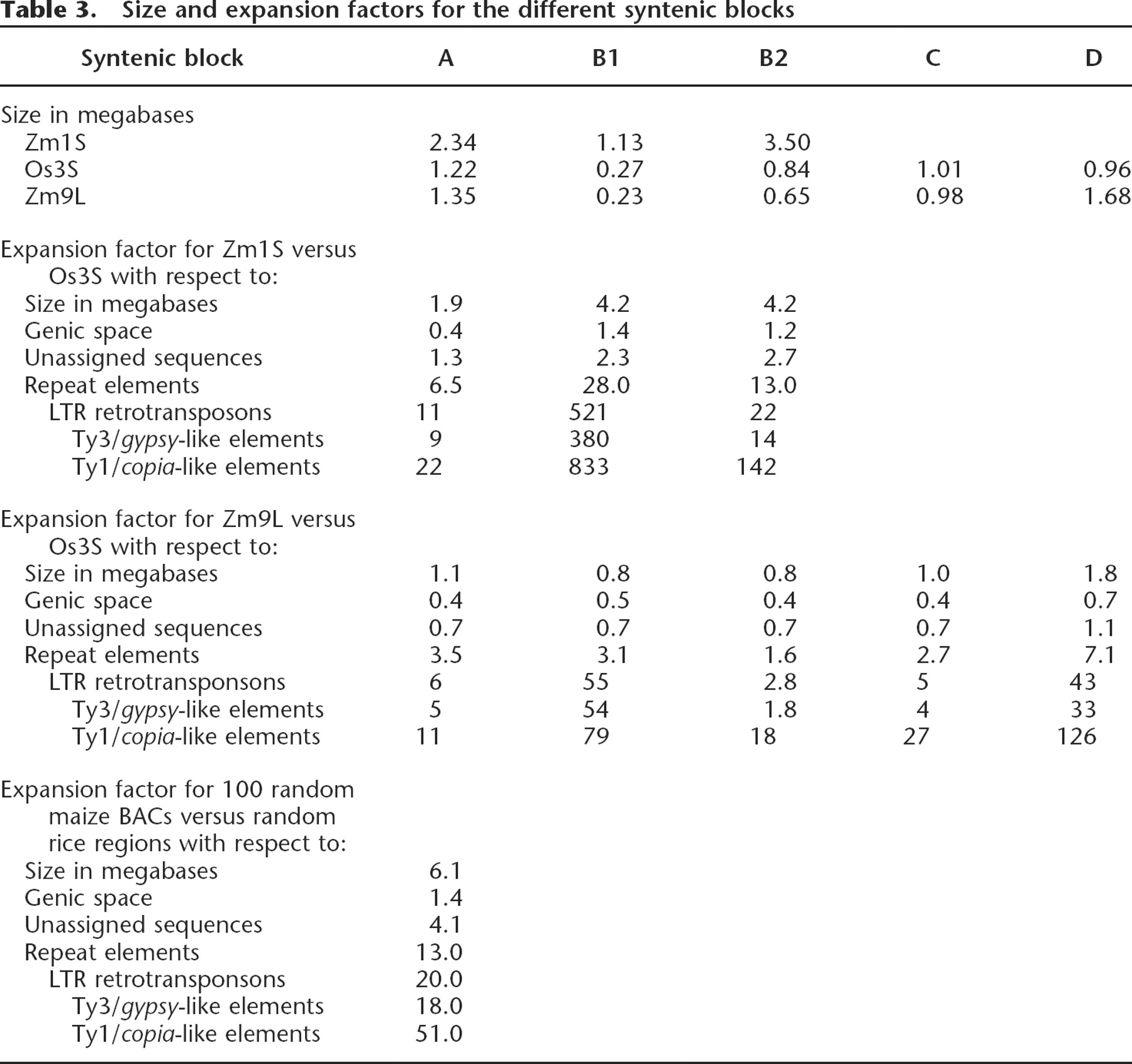 Size and expansion factors for the different syntenic blocks