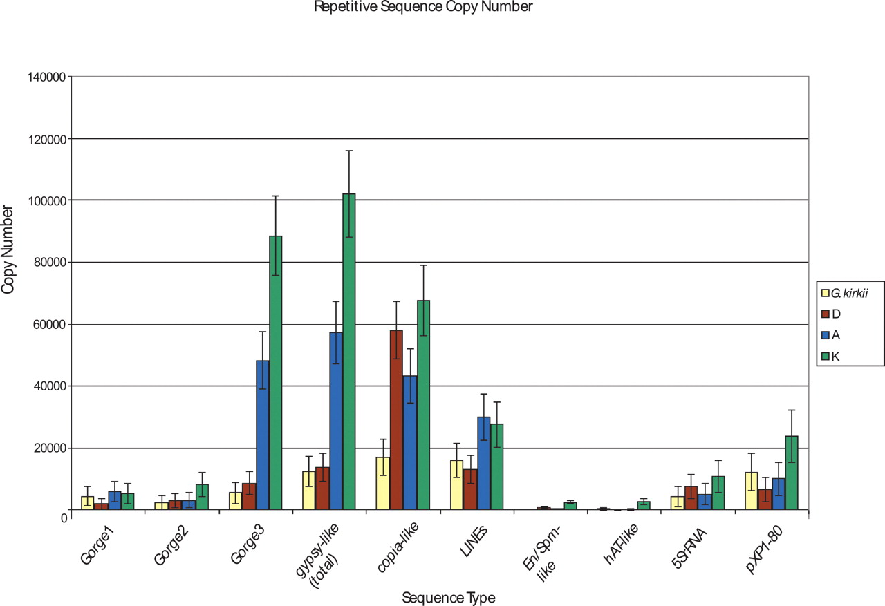 Copy number estimates for repetitive sequences in Gossypium. Copy numbers for repetitive sequences recovered in the WGS libraries were estimated as described (see Methods). The majority of repetitive sequences are LTR retrotransposons, particularly in the larger-genome species. In both the A and K genomes, massive amplification of Gorge3 gypsy-like sequences has occurred, contributing predominantly to genome size expansion in these two lineages. In the smallest Gossypium genome, G. raimondii (D genome), and copia-like sequences have proliferated and are primarily responsible for genome size expansion in this lineage. Class II sequences were less abundant and appear to contribute little to genome size evolution in the genus. Tandem repeats are approximately evenly distributed among all four species, with pXP1–80 sequences slightly elevated in G. exiguum (K genome).