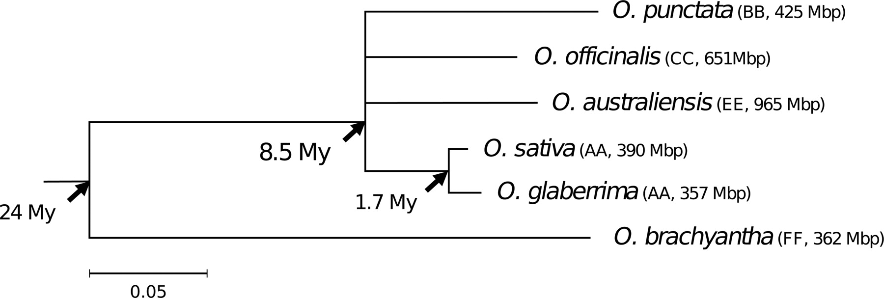 Phylogenetic tree of six diploid Oryza species, established with the ADH2 gene. Only nodes with a bootstrap value >70% are shown. The tentative dates of the radiation event are given for each node. The computational methods are given in the Methods section.