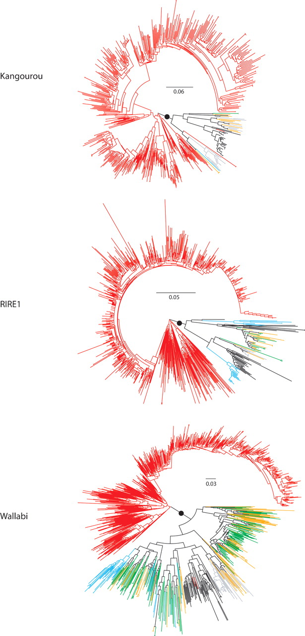 Phenetic relationships of RIRE1, Kangourou, and Wallabi in the genus Oryza: The neighbor-joining tree was constructed based on the alignments given in Supplemental data #3. For each tree, the dot shows the branch separating the O. australiensis sequences from the others. The number given near the dot corresponds to the bootstrap value. Color coding: black for the A-genome species; gray for O. punctata; orange forO. minuta; green for O. officinalis; blue for O. alta, and red for O. australiensis. The numbers of aligned sequences used to build the tree were as follows: for RIRE1: 752 O. australiensis sequences and 113 other Oryza sequences; for Kangourou: 570 O. australiensis sequences and 67 others; for Wallabi: 757 O. australiensis sequences and 422 others.