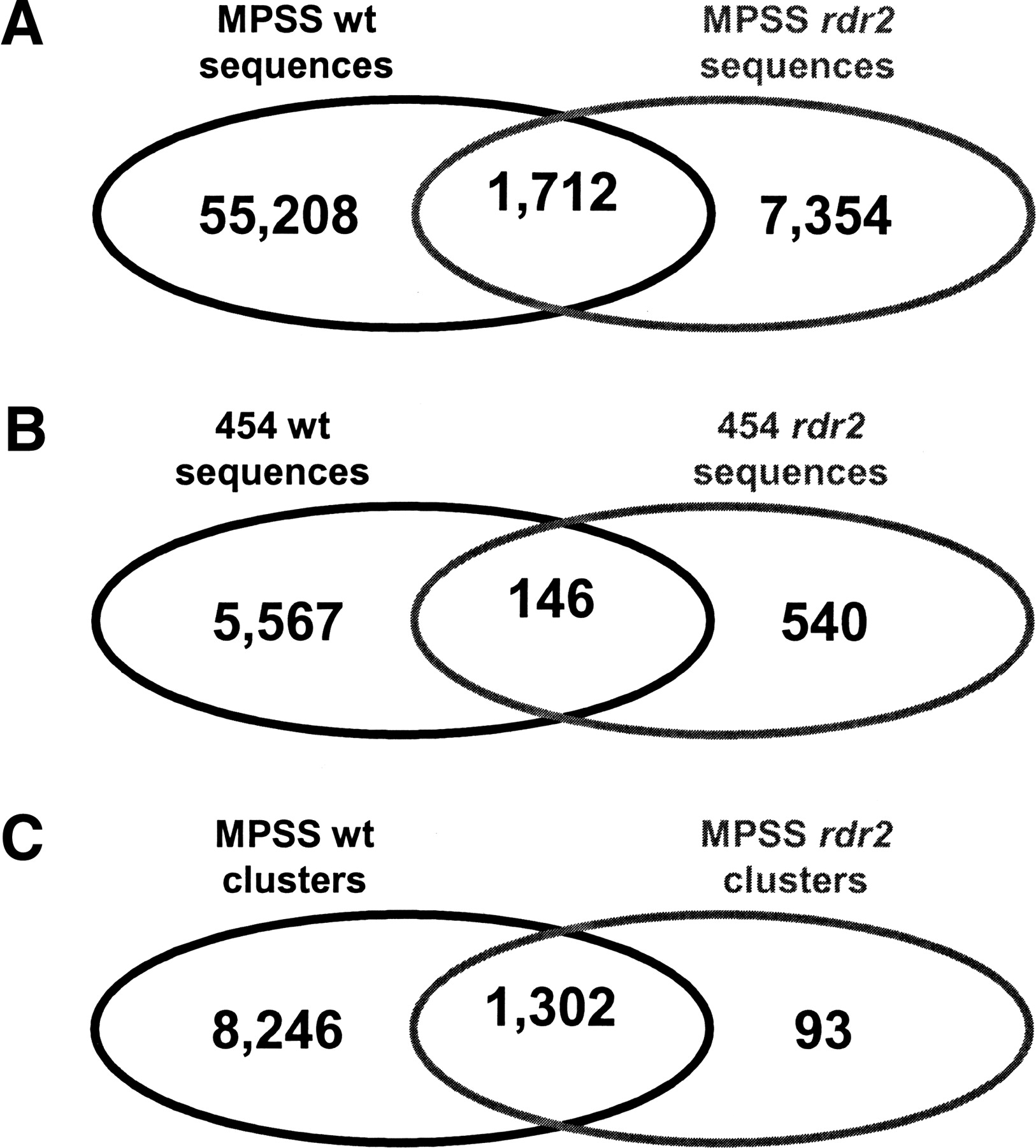Small RNAs or clusters common to wild type and rdr2. Venn diagrams representing genome-matched rdr2 454 and MPSS sequences from Table 1. (A) A comparison of distinct signatures in the MPSS libraries indicates 19% of rdr2 sequences were also found in wild type. (B) A comparison of distinct signatures in the 454 libraries indicates 21% of rdr2 sequences were also found in wild type. (C) A comparison of genomic clusters of MPSS signatures indicates 93% of small RNA clusters represented in rdr2 were also found in wild type. For this analysis, clusters contained at least three small RNAs across both libraries; this cutoff was chosen arbitrarily to remove clusters with only one or two small RNAs that could be background. Most of the rdr2-only clusters are low-abundance miRNAs or other “real” sequences that were not detected due to depth of coverage in the wild-type library.