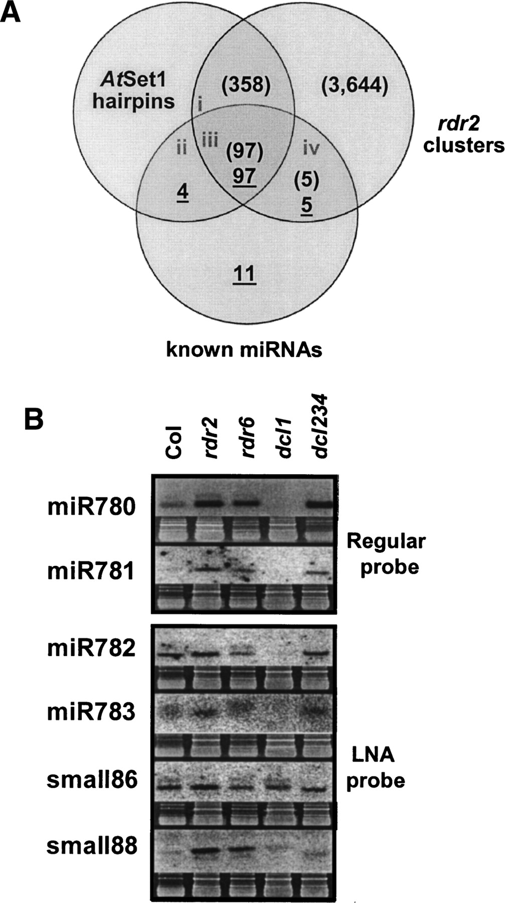 Estimating the minimal Arabidopsis miRNA population. (A) A Venn diagram to identify the number of miRNAs that may exist in Arabidopsis. Numbers in each section indicate sequences that satisfy each criterion, include AtSet1 hairpin folds (Jones-Rhoades and Bartel 2004), known miRNAs (underlined numbers), and genomic clusters of rdr2 MPSS signatures (numbers in brackets). AtSet1 and rdr2 clusters were considered matching if the start or end of either overlapped. Lowercase Roman numerals indicate sections from which sequences were selected in B. (B) Gel blots to evaluate the fraction of bona fide miRNAs in selected sectors. Small RNAs identified by rdr2 signatures in section (i) in A were randomly selected and evaluated by RNA gel blots to determine their presence/absence in the dcl1–7, dcl2/3/4, and rdr6 mutants. LNA probes were used for miR782, miR783, small86, and small88 (see Methods).