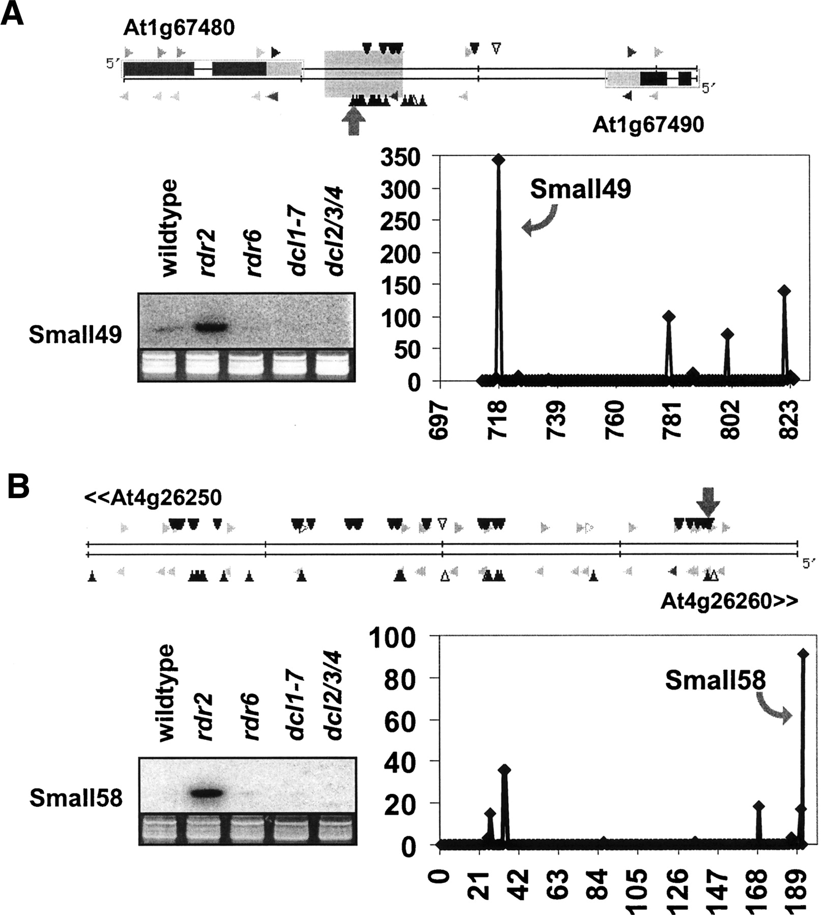RDR2-independent small RNAs from regions with ta-siRNA-like features. (A) The locus that includes small49 exhibits 21-nt phasing and accumulation characteristics in mutants similar to those of ta-siRNAs. Image of the MPSS Web viewer for the intergenic region that contains small49 in the position indicated by the large gray arrow (the shaded square covering both strands in this intergenic region indicates an inverted repeat); an RNA gel blot of small49; a plot of the y-axis indicating the small RNA abundance in the rdr2 mutant as measured by MPSS (in TPQ), and the x-axis indicating nucleotide position on Chr. 1, with the “697” indicating position 25,282,697. (B) The blot shows that small58 also has ta-siRNA-like accumulation features; images as described in A, with the 0 position in the x-axis of the plot indicating nucleotide 13,295,900 on Chr. 4. Due to limited space, only a portion of this intergenic region is shown, with the flanking genes indicated at the ends by their At identifiers.