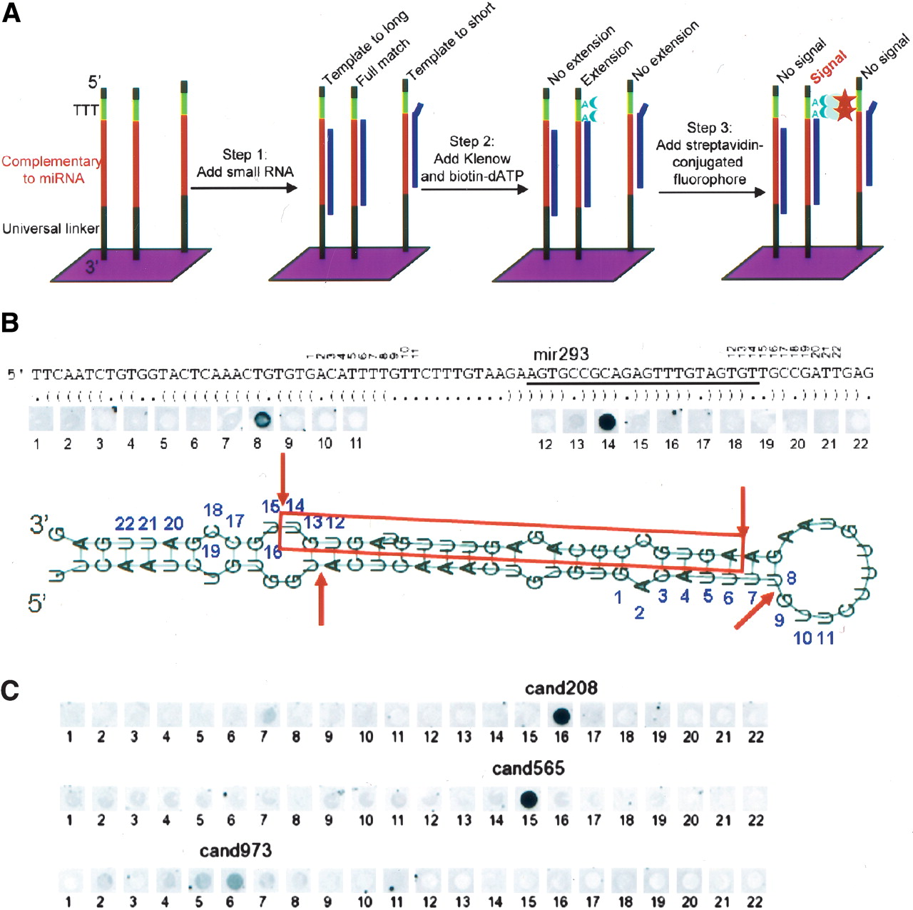 chematic representation of the modified RAKE assay (A) and experimental results obtained for known (B) and novel (C) candidate miRNAs. (A) A 44K microarray with a tiling path of 60-mer probes that are attached with their 3′ end to the glass surface was designed for the Agilent platform. Each DNA probe consists of a universal 3′ spacer sequence (black) followed by 22 nt of sequence complementary to the microRNA candidate (red), three thymidine nucleotides (green), and a short universal spacer (black). Unlabeled small RNA is hybridized to these arrays, followed by a Klenow extension reaction in the presence of biotinylated dATP. As miRNAs function as a primer for extension and the thymidines are the only template for extension, a complete 3′-end match is required for biotin incorporation and streptavidin fluorophore-mediated detection in the final step. (B) Schematic representation of the miR-293 pre-miRNA with predicted secondary structure and RAKE results. The mature miRNA (red) and numbers above the sequence indicate the 3′ end that fully matches the respective tiling path probe on the array. The strongest signal in the RAKE assay is obtained for probe 14, confirming the known 3′ end of miR-293. A weaker signal is obtained for probe 8, consistent with sensitive detection of the star sequence, which is produced as a side product from the hairpin structure by Drosha and Dicer nucleases that cut double-stranded RNA with a 2-nt 3′ overhang. The star sequence cannot be detected for all positive miRNAs. (C) RAKE results for three candidate miRNAs confirm the existence of novel miRNAs and identify the 3′ end of the mature miRNAs. For cand208 the star sequence can be detected (probe 7), whereas for cand973 multiple probes are positive with a rapidly decreasing intensity around the predominant probe, most likely representing imprecise 3′ end processing.