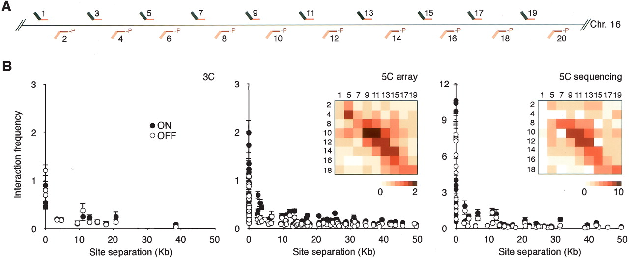 Analysis of the conformation of the gene desert control region. (A) Positions of alternating 5C forward (top) and reverse (bottom) primers throughout the gene desert control region. (B) Chromatin interaction frequencies of the gene desert region as determined by conventional 3C (left panel), by 5C and microarrays (middle panel), and by 5C and quantitative sequencing (right panel). Interaction frequencies are plotted vs. genomic distance between the interacting fragments. Bars represent the S.E.M. Interaction frequencies detected in K562 cells are also presented as two-dimensional heat maps in which the color of each square is a measure of the interaction frequency. Note: Primers 3, 6, and 20 recognize repetitive sequences. These primers were included to generate 5C libraries, but data obtained with these primers are not included in B. Interaction frequencies obtained with these primers are presented in Supplemental Table 7.