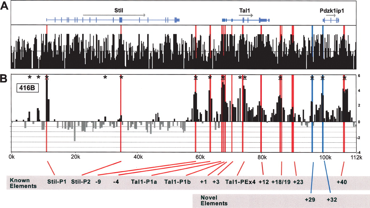 DNaseI hypersensitive site profiles across the mouse Tal1 locus. (A) Organization of the mouse Stil, Tal1, and Pdzk1ip1 genes, with wide and narrow bars representing translated and untranslated exons, respectively. The black bars represent the mouse/rat/human/dog/chicken overall conservation score quantified using phastCons (Siepel et al. 2005), derived using the MultiZ species alignment program (http://genome.ucsc.edu) (Hinrichs et al. 2006). (B) DNaseI sensitivity plot from 416B cells across the Tal1 locus. Fold enrichment over non-enriched input is plotted (log2) against genomic position in kilobases. The plots in B are the means of four independent array experiments, each hybridized in triplicate, as detailed in Methods. The width of each bar represents the width of each spotted PCR product on the array, with overlapping bars representing overlapping PCR products. Red bars represent known regulatory elements, while blue bars represent novel elements identified in this study. Significant enrichments (P ≤ 0.05) are indicated with an asterisk or asterisk + bar (at least two adjacent tiles). (0k) Mouse chromosome 4 coordinate 113,334,279 (NCBI build 33). Functional elements are described in Table 1 and the text, and refer to the location in kilobases relative to the start of mouse Tal1 exon 1a.