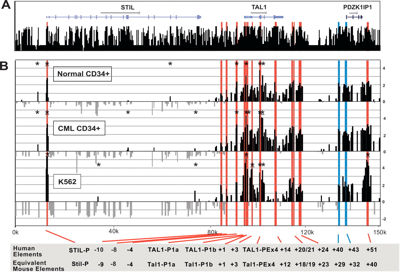 DNaseI hypersensitive site profiles across the human TAL1 locus. (A) Organization of the human STIL, TAL1, and PDZK1IP1 genes, with wide and narrow bars representing translated and untranslated exons, respectively. The black bars represent the human/chimp/mouse/rat/dog/chicken/ Fugu/zebrafish overall conservation score quantified using phastCons (Siepel et al. 2005), derived using the MultiZ species alignment program (http://genome.ucsc.edu) (Hinrichs et al. 2006). (B) DNaseI sensitivity plot from normal donor and CML CD34+ cells and K562 cell lines across the TAL1 locus. Fold enrichment over non-enriched input is plotted (log2) against genomic position in kilobases. The normal donor and K562 plots represent the mean values of four independent array experiments, while the CML data represent the mean of two separate experiments, each hybridized in triplicate as detailed in Methods. The width of each bar represents the width of each spotted PCR product on the array, with overlapping bars representing overlapping PCR products. Red bars represent known regulatory elements or regions homologous to known mouse regulatory elements. The blue bars locate the human region homologous to the novel mouse regulatory elements identified in this study. Significant enrichments (P ≤ 0.05) are indicated with an asterisk or asterisk + bar (at least two adjacent tiles). (0k) Human chromosome 1 coordinate 47,505,065 (NCBI build 35). Functional elements are described in Table 1 and the text, and refer to the location in kilobases of the conserved elements relative to the start of human exon 1a.