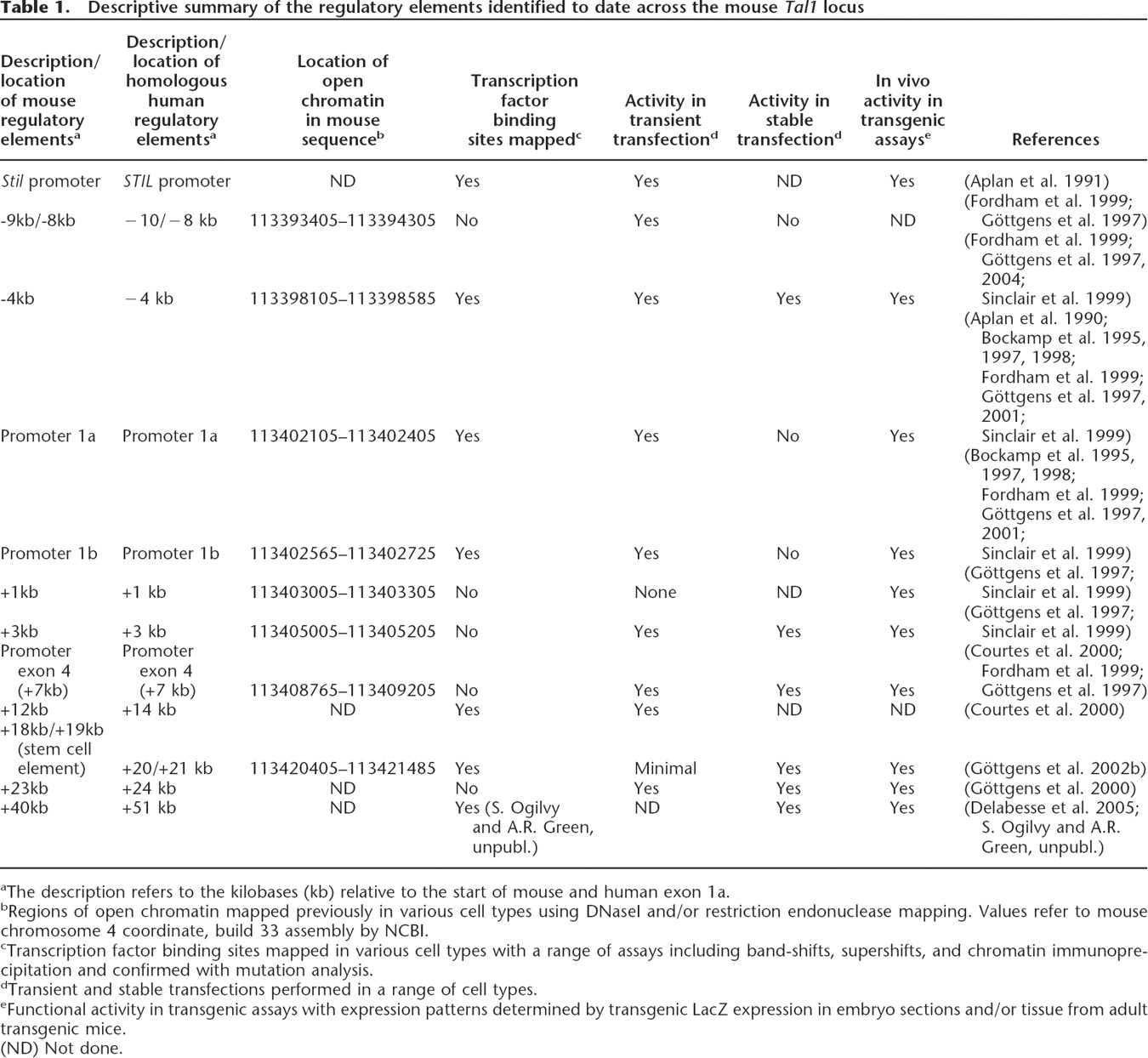 Descriptive summary of the regulatory elements identified to date across the mouse Tal1 locus