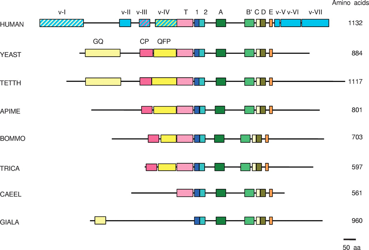 Schematic showing conserved domains in selected TERTs from vertebrates, fungi, ciliates, insects, nematodes, and Giardia. The domains are as previously identified for these TERTs (Malik et al. 2000; Xia et al. 2000; Kuramoto et al. 2001; Yap et al. 2005). See Supplemental data for the details of accessions. To avoid repetition, not all the TERTs listed there are shown in this figure; those not shown closely resemble one of those depicted.