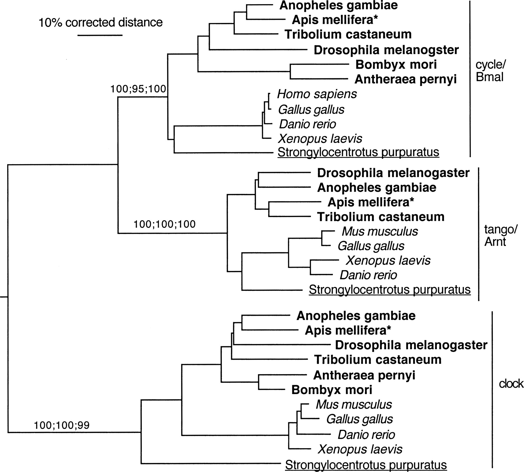 Phylogenetic relationships of the Cycle/Bmal, Tango/Arnt, and Clock protein family. We used the Clock protein as an outgroup to root the tree based on its divergence from the Cycle/Bmal and Tango/Arnt sister proteins. Support levels are shown only for the main protein lineages, which are separated slightly vertically for visual clarity (percentage of trees showing a branch in distance and parsimony bootstrapping, followed by percentage of maximum likelihood quartet puzzling steps). Distinct font styles are used to highlight major taxonomic lineages. Bold for insects, italics for vertebrates, underline for the sea urchin, and plain for all the others. The honey bee Apis mellifera is highlighted with an asterisk.