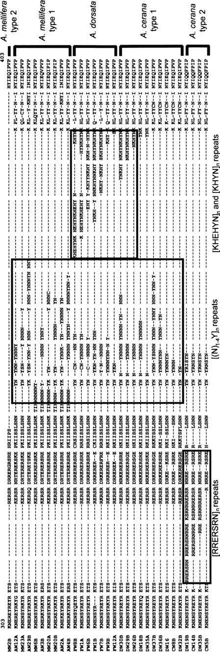 Three different kinds of repititive sequences exist in csd of three honey bee species. The name of each repeat type is shown under the boxed area. The names of the bee samples, from which the sequences are obtained, are shown to the left of the sequences. Numbers in the first row indicate the positions of the first and last amino acid residues in the sequence of MW2B.