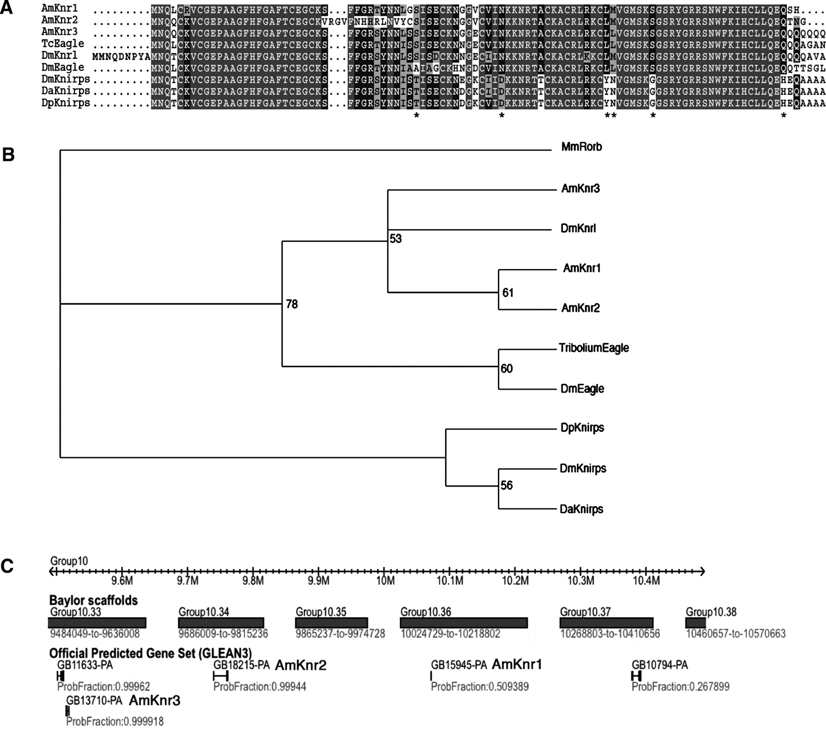 The honey bee genome contains three knirps-related genes. (A) Amino acids sequence comparison of the Zn finger domain from Knirps-related proteins including those predicted from the honey bee genome sequence. Asterisks indicate residues that are conserved in kni but not egon proteins; (Dp) Drosophila pseudoobscura. (B) Phylogenetic analysis of the Cys–Cys finger domains from Knirps-related proteins. kni from D. melanogaster forms a clade with kni proteins from other Drosophila species. (C) Genomic location of honey bee knirps-related genes. The three predicted knirps-related genes (knr1, knr2, and knr3) are clustered on Baylor scaffold group 10.