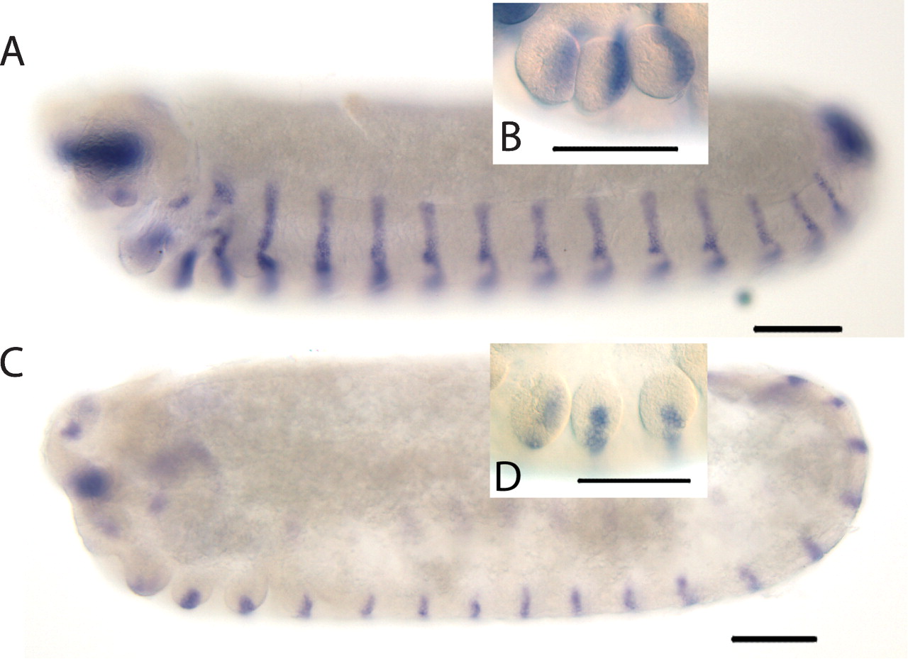 Expression of honey bee hh and wingless (wg) in embryos. Embryos are oriented anterior-left, dorsal-up. Scale bars, 100 μm. (A) hh RNA expression in a stage 10 embryo. Honey bee hh is expressed in a stripe of cells in the posterior of each segment, a pattern similar to the expression of engrailed-like proteins (Fleig 1990) and e30 and e60 mRNA (Osborne and Dearden 2005b). (B) Magnification of the gnathal segments of a stage 10 embryo stained for honey bee hh RNA. hh RNA is located in the posterior of each limb bud. (C) Honey bee wg RNA expression in a stage 9 embryo. wg RNA is expressed in a stripe of cells in each segment. (D) Magnification of the gnathal segments of a stage 9 embryo stained for wg RNA showing expression in a stripe of cells running across the middle of each limb bud.