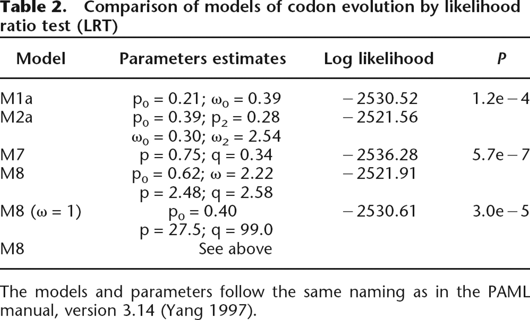 Comparison of models of codon evolution by likelihood ratio test (LRT)