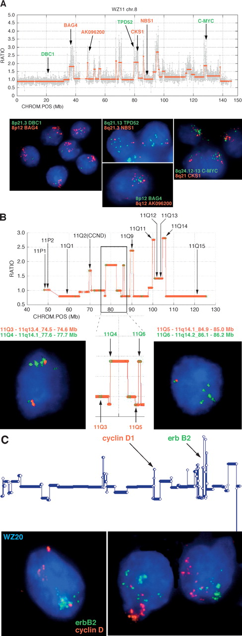 Validation of peaks and valleys in ROMA profiles by interphase FISH. (A) Expanded ROMA profile of a firestorm on chromosome 8 in the diploid tumor WZ11. The graph shows the normalized raw data (gray) and segmented profile (red) along with the genes for which the probes shown in the FISH images were constructed. Several distinct conditions are exemplified in the images. First, the ROMA profile indicates that the 8p arm is deleted distal to the 8p12 cytoband yielding a single copy of DBC1 (green), but >10 tightly clustered copies of BAG4, which is located in the frequently amplified 8p12 locus (Garcia et al. 2005). Tight clusters of multiple copies corresponding to ROMA peaks are also shown in the FISH images for CKS1A, MYC, TPD52, and the uncharacterized ORF AK096200. Note that the FISH signals corresponding to distinct loci cluster together irrespective of their distance on the same arm (CKS1A/MYC) or across the centromere (BAG4/AK096200). Finally, the spaces between ROMA peaks on 8q, exemplified by NBN (formerly known as NBS1), uniformly show two copies as indicated by the ROMA profile. (B) Expanded view of the centromere and 11q arm from diploid tumor WZ17 showing correspondence of the copy number as measured by FISH with the copy number predicted by the ROMA profile. The y-axis represents the segmented ratios of sample versus control. Chromosome position on the x-axis is in megabases according to Freeze 15 (April 2003) on the UCSC Genome Browser (Karolchik et al. 2003). FISH probes were amplified from primers identified from specific loci using PROBER software (Methods).The insert outlined in black is magnified to show specific details. Comparative data for the probes shown in black are not shown but are available on our Web site. In the boxed region, note that in the nonamplified regions the ROMA profile predicts two copies of the arm proximal to the leftmost amplification. Consistent with the profile, the FISH image shows two copies of probe 11Q3, with one of the spots located in the cluster along with the amplified copies. The amplicon to the right yields four copies by FISH (probe 11Q4). The ROMA profile for the amplicon represented by probe 11Q6 suggests that it is in a region in which the surrounding nonamplified portion of the arm is deleted. This arrangement is commonly observed in firestorms and is confirmed by the FISH image showing one pair of the loci 11q5 and 11Q6 together, representing the intact arm, and no copy of probe 11Q5 in the amplified cluster of spots for 11Q6. (C) Profile of tumor WZ19 in which two firestorms are observed on chromosomes 11q and 17q. In contrast to the overlapping clusters shown in A, amplifications on unrelated arms visualized using FISH probes for CCND1 and ERBB2 cluster independently in the nucleus.