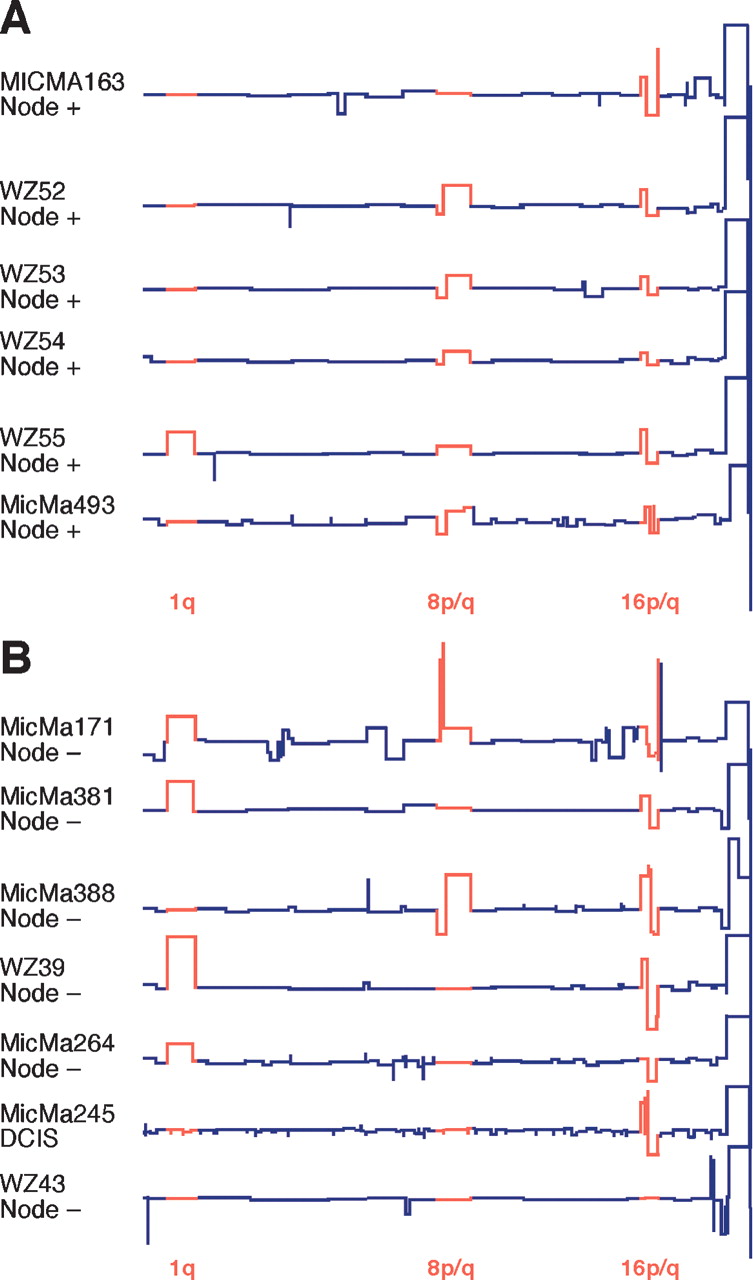 Comparison of Grade I and DCIS tumors by ROMA. Segmented ROMA profiles of six node-positive (Fig. 5A) and seven node-negative (Fig. 5B) Grade I or DCIS tumors, representing a total of 24 examples from the combined Swedish and Norwegian collections. Most frequent rearrangements are depicted in red.