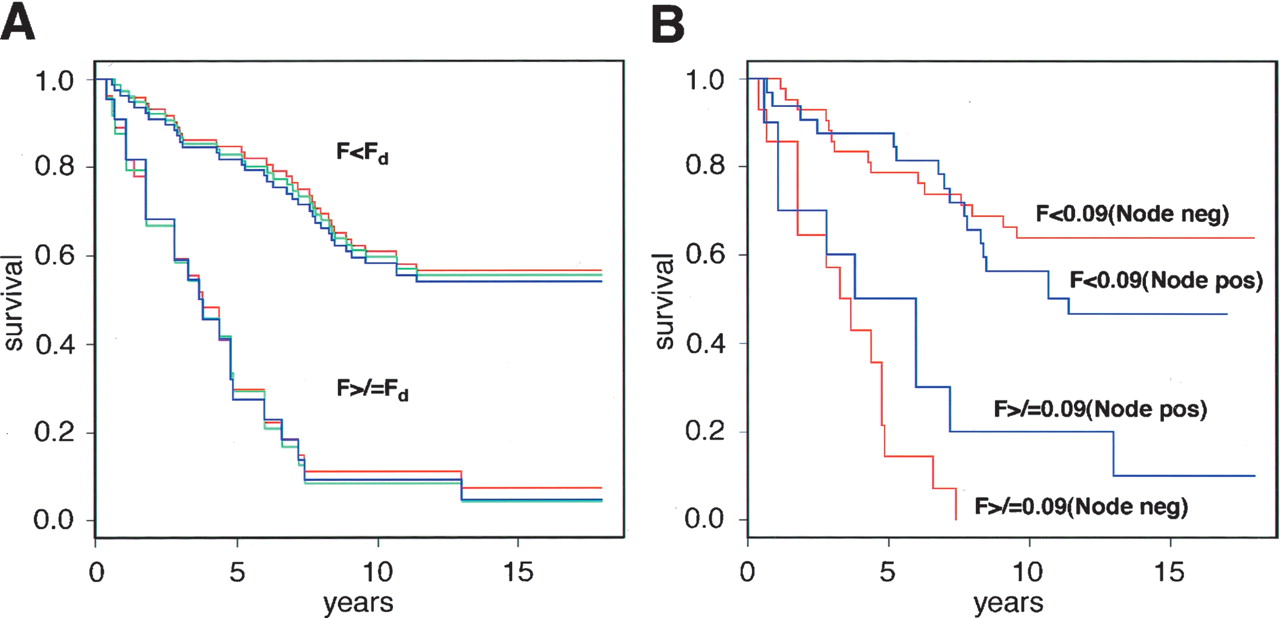 Kaplan-Meier plots of the Swedish diploid subset grouped according to the Firestorm Index (F). (A) Complete Swedish diploid data set grouped according to three different discriminator settings (Fd) of F: Fd = 0.08 (red); Fd = 0.09 (blue); Fd = 0.1 (green). (B) Swedish diploid data set separated into node-negative (red) and node-positive (blue) subsets with Fd set to 0.09.