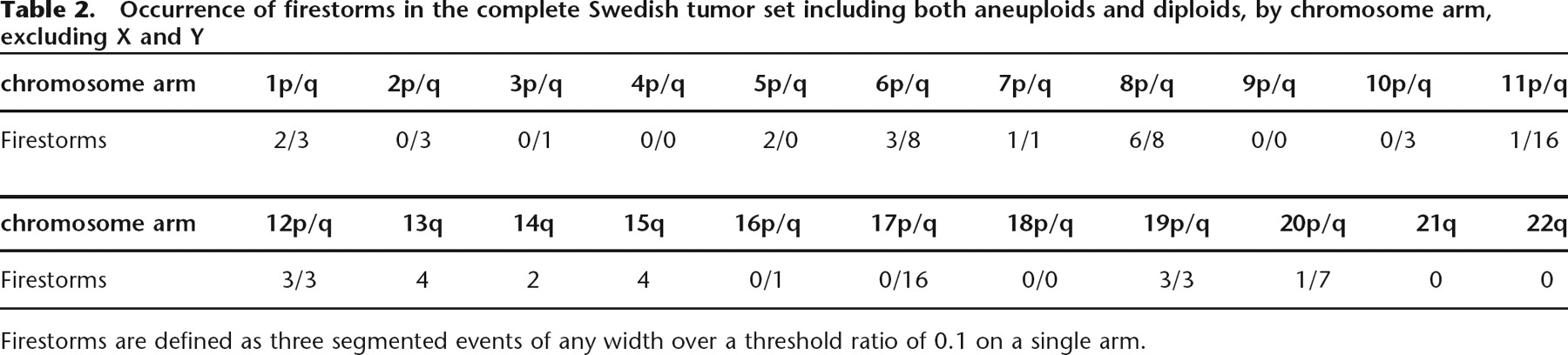 Occurrence of firestorms in the complete Swedish tumor set including both aneuploids and diploids, by chromosome arm, excluding X and Y