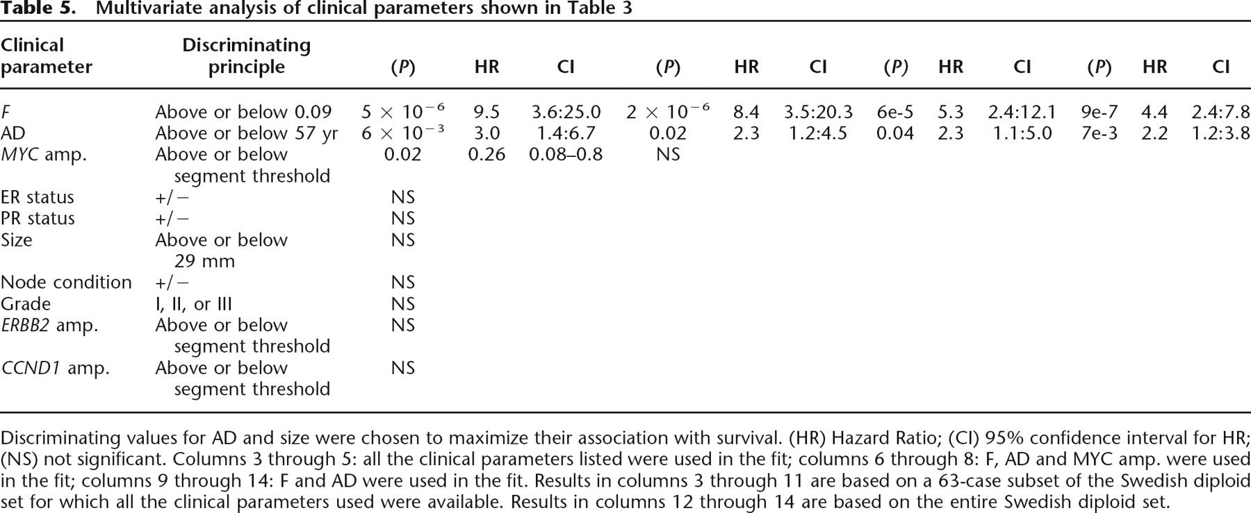 Discriminating values for AD and size were chosen to maximize their association with survival. (HR) Hazard Ratio; (CI) 95% confidence interval for HR; (NS) not significant. Columns 3 through 5: all the clinical parameters listed were used in the fit; columns 6 through 8: F, AD and MYC amp. were used in the fit; columns 9 through 14: F and AD were used in the fit. Results in columns 3 through 11 are based on a 63-case subset of the Swedish diploid set for which all the clinical parameters used were available. Results in columns 12 through 14 are based on the entire Swedish diploid set.