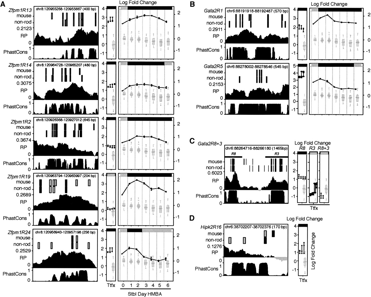 Examples of validated preCRMs in three loci. Selected validated preCRMs from Zfpm1 (A), Gata2 single preCRMs (B), a combination of preCRMs from Gata2 (C), and Hipk2 (D) are shown; features and activities of other validated preCRMs are shown in the Supplemental figures. The conventions for displaying features and activities are the same as in Figure 3.