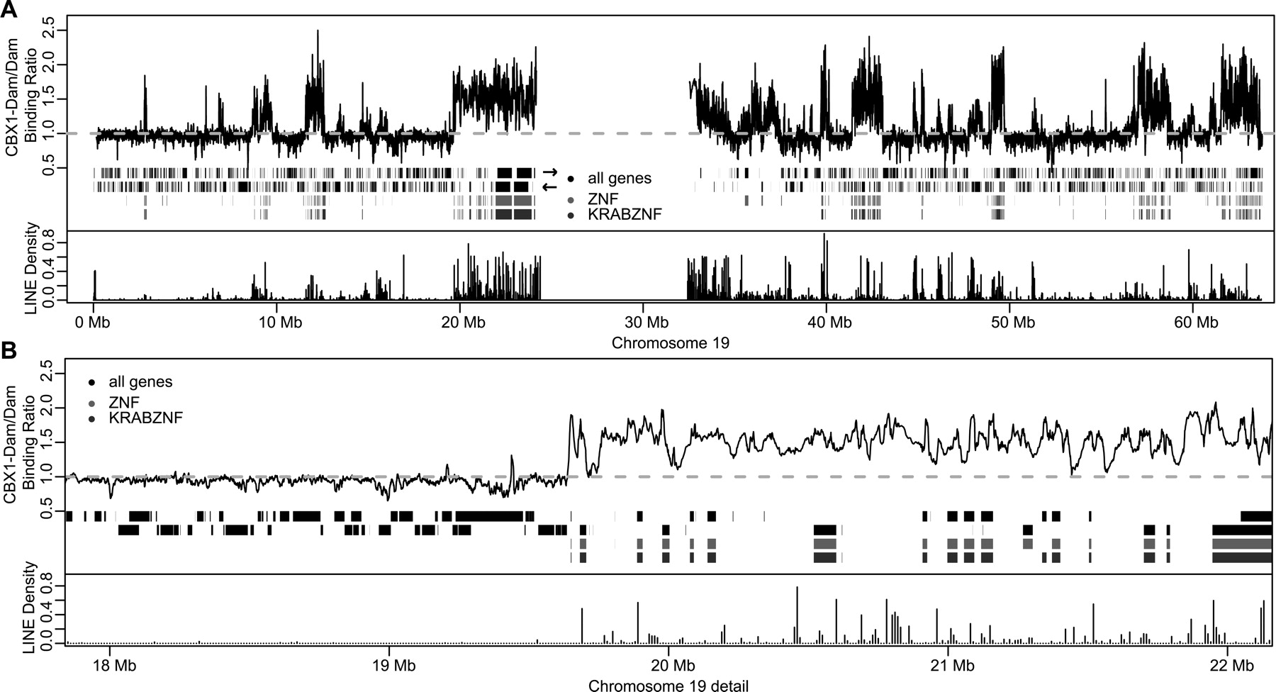 CBX1 binding forms large domains on chromosome 19. (A) Chromosomal map of CBX1 binding along Chr19. (Top panel) The black line represents the running mean (window size = 20 probes) of CBX1 binding to Chr19. From top to bottom: Black bars represent Ensembl annotated genes on the + and − strands. Light gray bars are zinc finger genes and dark gray bars are KRAB-ZNF genes. (Bottom panel) Bars show the LINE density per 10 kb along Chr19. (B) Same as in A, enlargement of 4 Mb of the chromosomal map. Data are the average of two experiments.