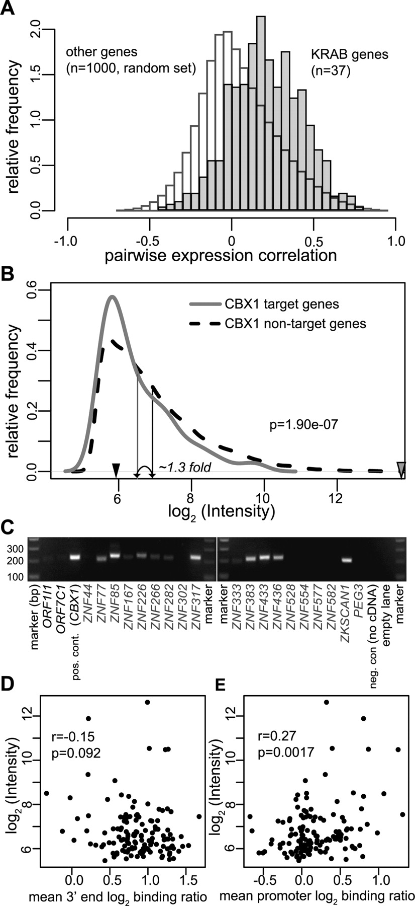 Expression of KRAB-ZNF genes and CBX1 target genes. (A) KRAB-ZNF genes are coexpressed in 79 human tissues. Microarray expression data for 37 KRAB-ZNF genes or 1000 randomly picked non-KRAB-ZNF genes were obtained from Su et al. (2004). For each gene pair, the pairwise Pearson correlation in expression throughout 79 different tissues was calculated. Histograms present pairwise correlation coefficients between KRAB-ZNF genes (gray) or non-KRAB-ZNF genes (white). (B) CBX1 target genes have slightly lower expression levels than CBX1 nontarget genes in MCF7 cells. MCF7 expression profiles were made on coding region oligonucleotide arrays and the density distribution of spot intensities (log2 √(Cy5 × Cy3)) of CBX1 target genes (gray line) and CBX1 nontarget genes (dashed black line) is shown. The average spot intensity per group is indicated by vertical arrows. P-value is according to the Wilcoxon rank sum test. The expression levels of an inactive gene (Testis-Specific Serine Kinase Substrate) and a highly active gene (beta-actin) are indicated by black and gray arrowheads, respectively. (C) The majority of KRAB-ZNF genes is expressed in MCF7 cells. RT-PCR of 19 KRAB-ZNF genes. ZNF436, ZNF167, ZKSCAN1, and ZNF282 are located on chromosomes 1, 3, 7, and 7, respectively. The other KRAB-ZNF genes are located on Chr19. Controls include the ORF1I1 and ORF7C1 olfactory receptor genes that are expected to be repressed in MCF7 cells, CBX1 that is expressed in MCF7 cells, and a negative control with CBX1 primers without cDNA. (D,E) Correlation between expression level and CBX1 binding to 3′ end (D) or promoters (E) of KRAB-ZNF genes. Average CBX1 binding to the last 3′ 2 kb or to the 2 kb surrounding the transcriptional start site of 139 KRAB-ZNF genes was linked to the expression data from B. P-values are according to Spearman’s ρ statistic.