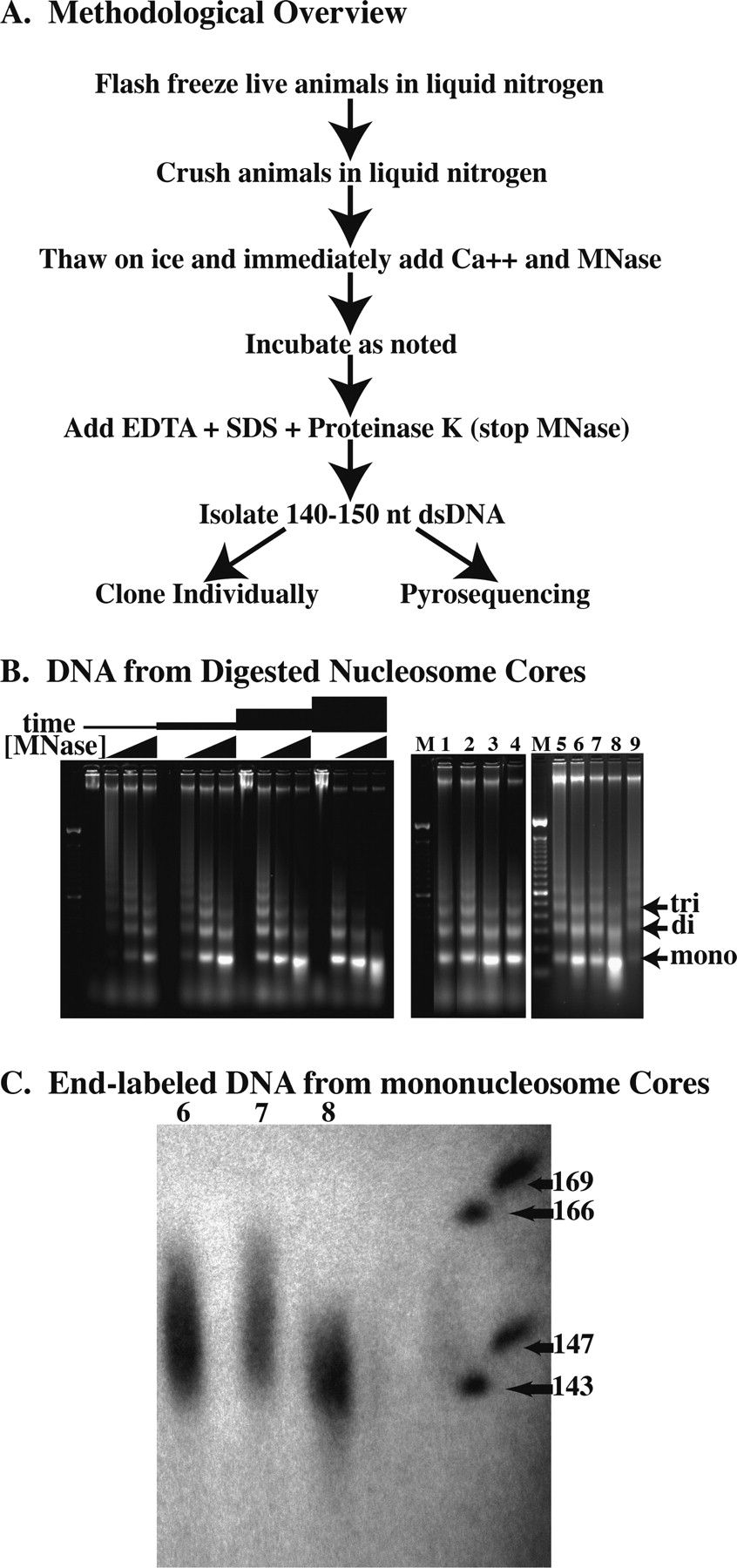 Digestion of C. elegans chromatin in situ to generate core fragments. (A) Overview of the methodology used to isolate nucleosome core DNAs. (B) Electorphoretic gel analysis of micrococcal nuclease-digested chromatin showing the descending-ladder effect with increased micrococcal nuclease digestion. Gel at left shows digestions performed with increasing concentrations of micrococcal nuclease (0, 0.2, 0.8, and 3.2 U/μL) for various amounts of time (2, 6, 18, and 54 min) at 25°C. Lanes 1–9 of the right gel correspond to DNA isolated from the various digestion conditions (digests #1–#9) as described in Table 1. (C) Sequencing gel showing end-labeled mononucleosome core DNA from digestion conditions #6, #7, and #8 in lanes 6, 7, and 8, respectively.