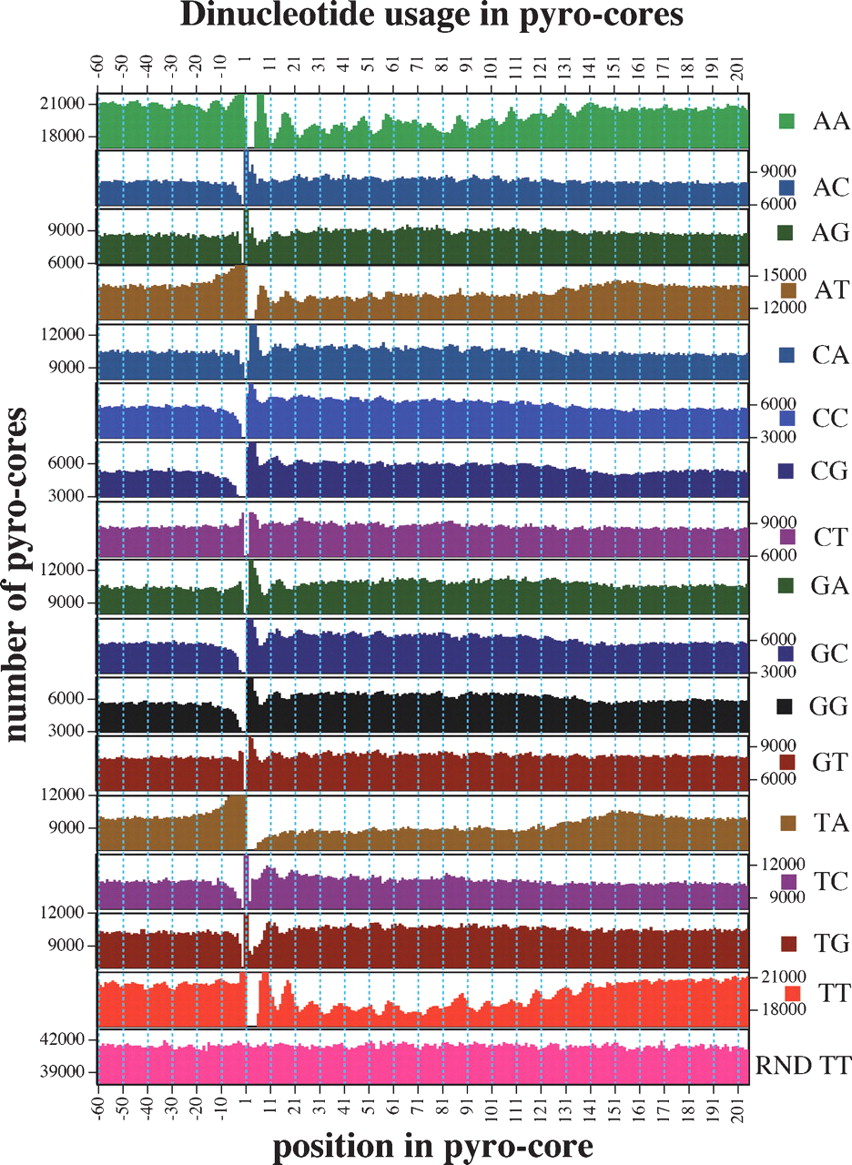 Positional dependence of dinucleotide composition in core and flanking sequences. Graphs show incidence of each dinucleotide at every position in the set of 163,651 unique pyro-core sites. Positions 1–146 show incidence in the presumed core nucleosome, while flanking sequences show the 60 nt preceding and following the pyro-core (positions −60 to −1 and 147–206, respectively). RND TT is a parallel analysis performed on a simulated set of random core segments constructed in silico from C. elegans’ DNA. In each graph, the scale of the ordinate is the same and shows a 5000 core range.