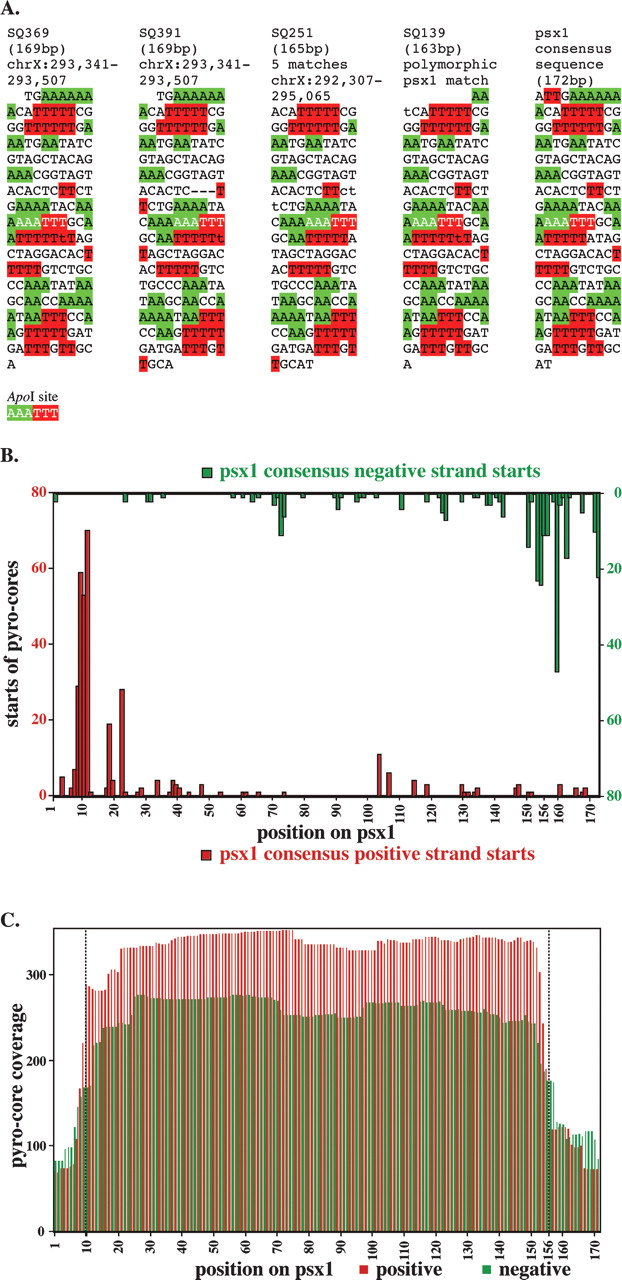 A reiterated genetic element with constrained core positioning. (A) Sequences of four closely matching cores from the original (manually isolated) series of 346 clones. These four clones, isolated from three different chromatin digestion conditions and four separate ligations, correspond to variants of a repeated sequence, designated psx1, present in the C. elegans genome (Bao and Eddy 2002). Individual polymorphisms relative to a consensus version (right) of psx1 are printed in lowercase. Runs of two or more consecutive A’s or T’s are highlighted in green and red, respectively and the sequences are displayed in 10-nt sections. (B) Starts of pyro-core sequences mapping to psx1 copies. Red and green are data from positive and negative starts, respectively. (C) Coverage plot of positive (red) and negative (green) pyro-core data for psx1.