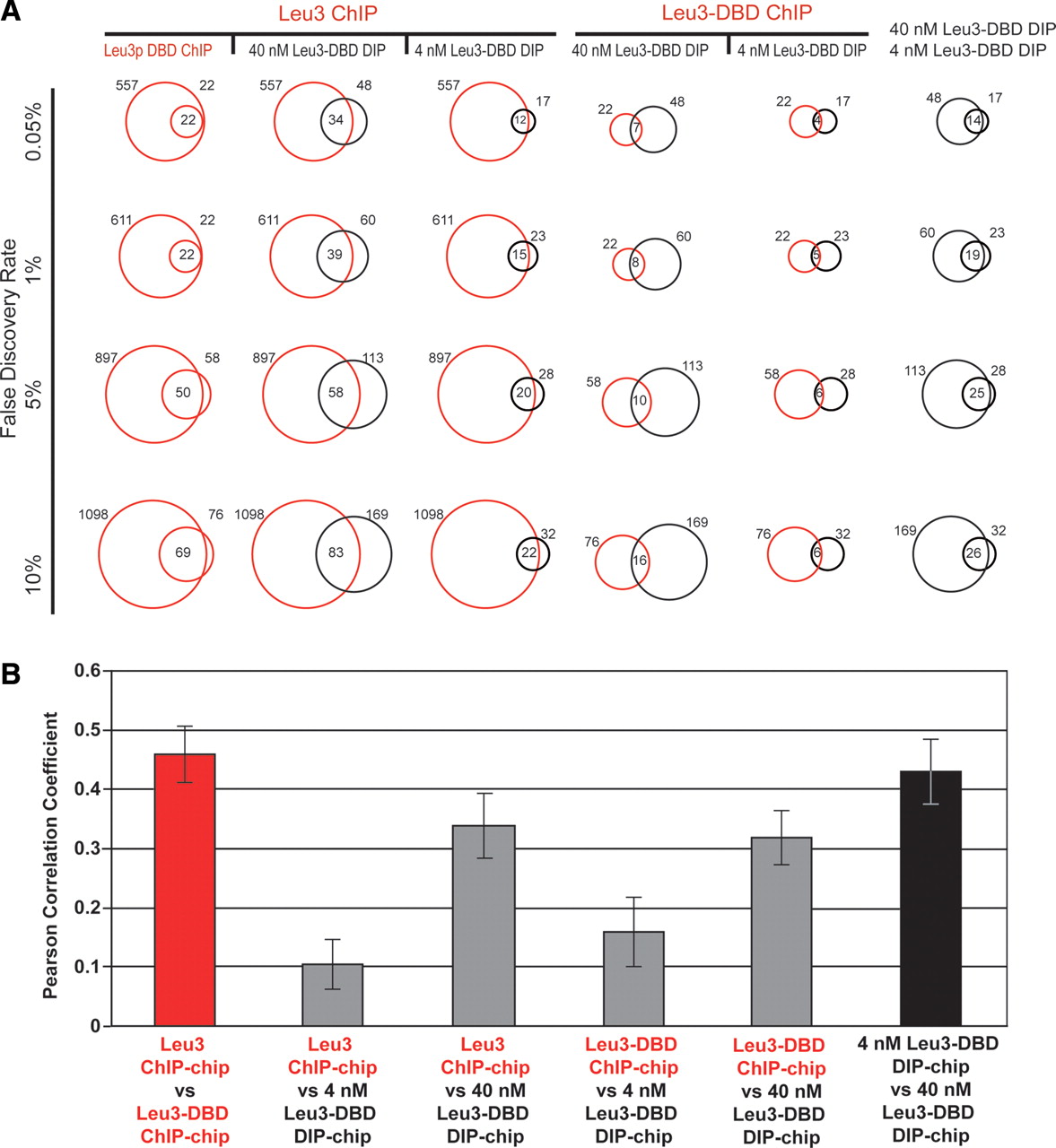 Leu3 binds different genomic locations in vivo and in vitro. (A) Each vertical column contains comparisons of two Leu3 genomic binding experiments. Each horizontal row shows pairwise comparisons at the indicated FDR (0.05%, 1%, 5%, or 10%). FDRs were calculated based on P-values derived from a modified single-array error model (SAEM: Methods). Red circles represent the number of targets bound in the indicated in vivo ChIP-chip experiments, and black circles represent the number of targets bound in the indicated in vitro DIP-chip experiments. In all columns, the circle to the left corresponds to the upper-most label on the top row, while the circle to the right corresponds to the lower label. Numbers to the left and right of the circles indicate the total number of Leu3-bound loci. The number of Leu3-bound loci common to both experiments is indicated in the intersection of the circles. (B) In vivo experiments (red) and in vitro experiments (black) are more highly correlated with each other than are data across experiment types (gray). For each pairwise comparison, the Pearson’s correlation of all log (SAEM; P-values) is shown.