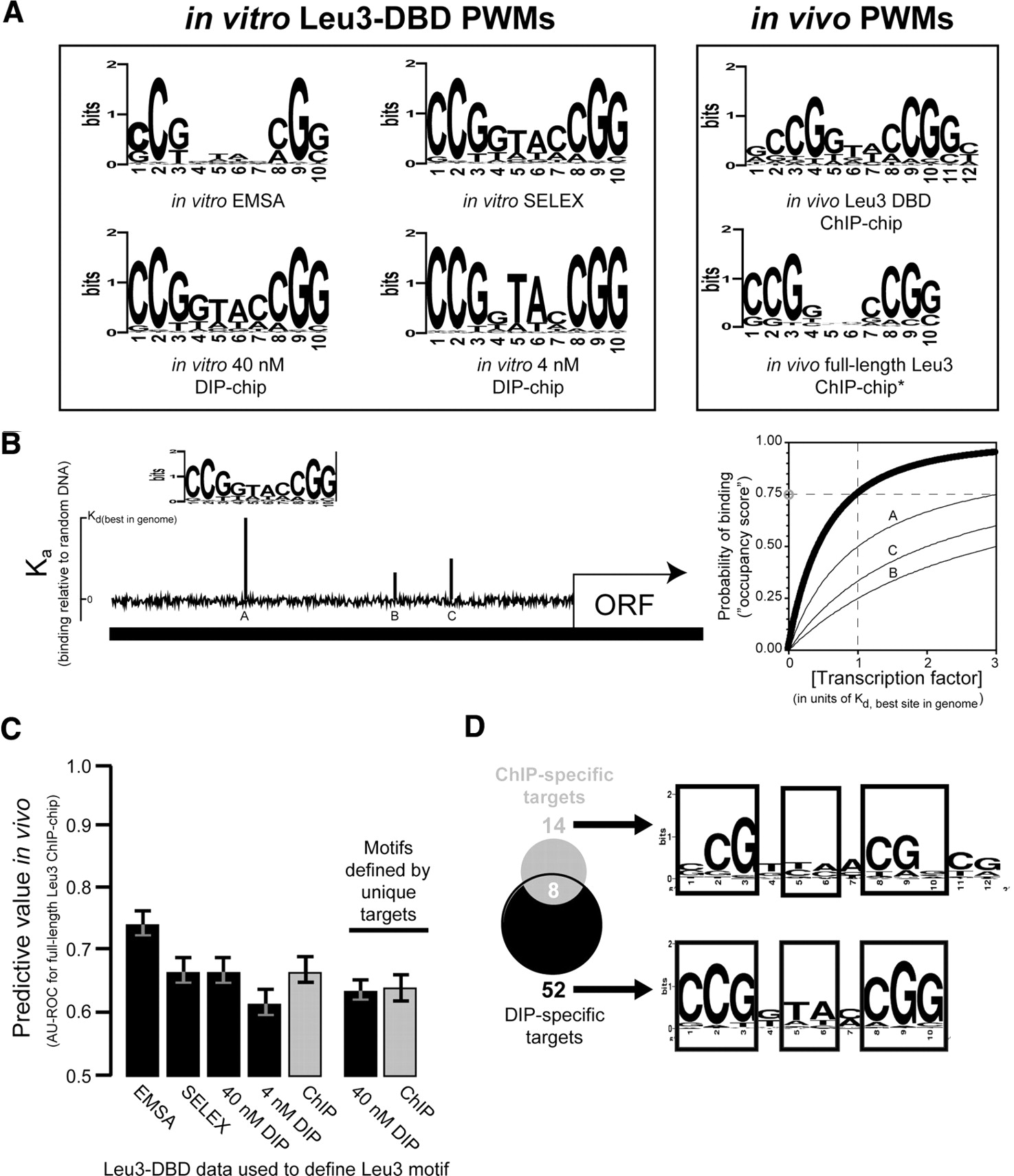 Motifs derived from in vitro methods predict in vivo protein–DNA interactions as accurately as motifs derived from in vivo ChIP-chip. (A) Six PWM representations of the Leu3 binding motif, derived from the indicated binding experiments (Methods). (B) A schematic representation of motif scoring by GOMER. Briefly, given a PWM for a binding motif N bp long, GOMER calculates a relative equilibrium binding constant (Kd) for each sequence window of length N in the genome, and from this Kd value calculates the probability of being bound at some free protein concentration (typically equal to the Kd of the best site in the genome). GOMER then uses these individual binding probabilities to calculate the probability of binding to at least one site within a genomic sequence of interest. The graph (right) indicates the probability that sites A, B, and C (left) will be occupied by a factor recognizing the motif shown, as a function of protein concentration. The thick line shows the probability that any one of the three sites will be bound at the given concentration. In this example, if the protein is present at a concentration equal to the Kd of the best site in the genome, there is a 75% chance that the shown promoter will be bound at either A, B, or C at a given point in time (gray circle). (C) AUC-ROC values (y-axis) for prediction of full-length Leu3 ChIP-chip results based on motifs derived from the indicated data set. Error bars indicate the 95% confidence interval estimated using bootstrap resampling of occupancy scores and Leu3 enrichments. (D) Similar motifs are derived from genomic targets unique to DIP or ChIP.