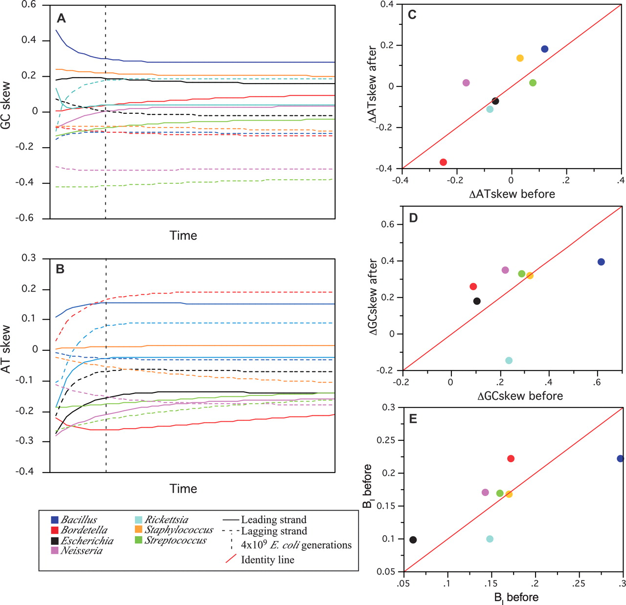 Evolution of (A) GC skews and (B) AT skews from actual values to the values close to equilibrium in each replicative strand of each clade using the substitution frequencies computed in Supplemental Table 2. The results for the leading strand are in solid lines, and the results for lagging strands are in dashed lines. The units in the x-axes are arbitrary and represent the iteration of the transition matrix in the simulations. To provide an order of magnitude of the number of generations required to attain equilibrium, we indicate by a dashed vertical line the point corresponding to 4 × 109 E. coli generations (∼20 million yr). This calculation is just indicative and assumes a mutation rate of 10−9 per generation and 200 generations per year. (C) ΔAT skew, (D) ΔGC skew, and (E) BI change from the actual genome (before) to the values predicted at equilibrium (after).