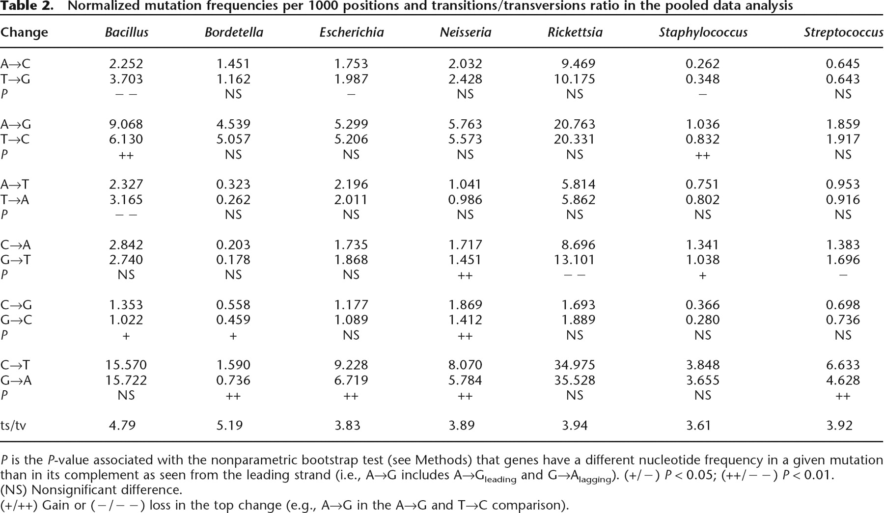 P is the P-value associated with the nonparametric bootstrap test (see Methods) that genes have a different nucleotide frequency in a given mutation than in its complement as seen from the leading strand (i.e., A→G includes A→Gleading and G→Alagging). (+/−) P < 0.05; (++/−−) P < 0.01.