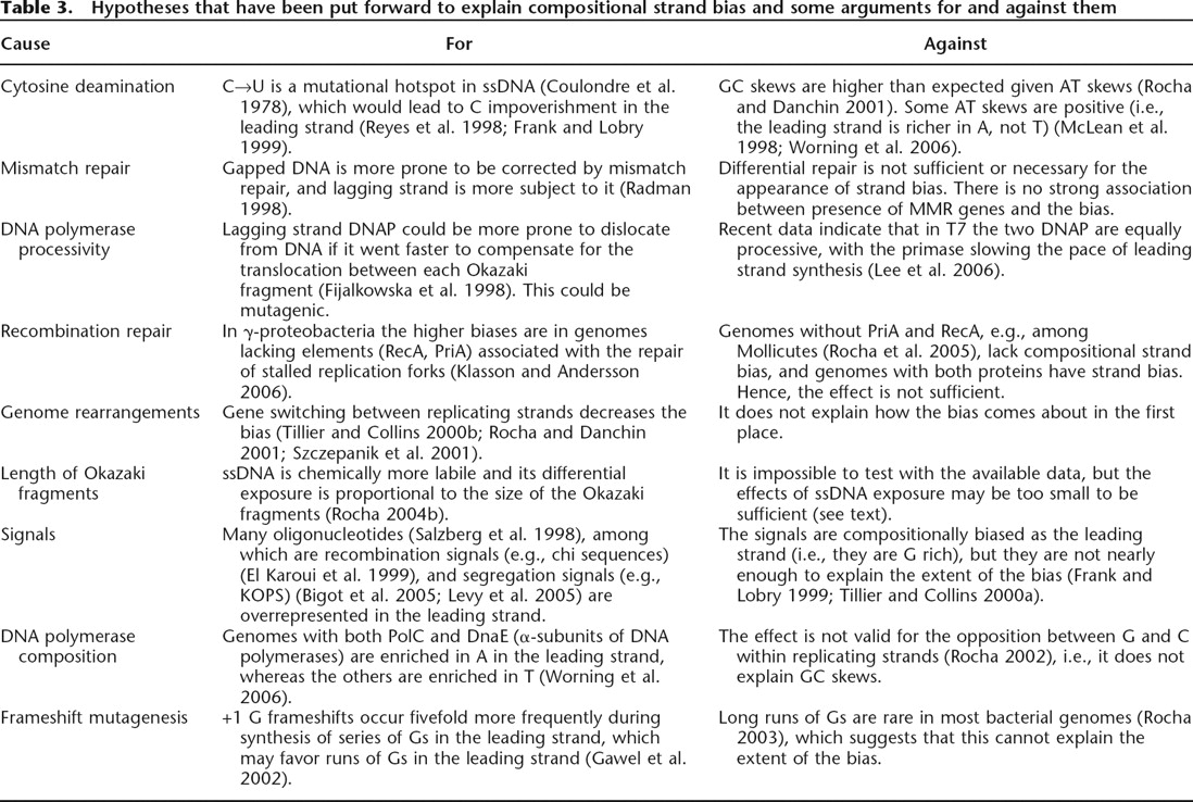 Hypotheses that have been put forward to explain compositional strand bias and some arguments for and against them
