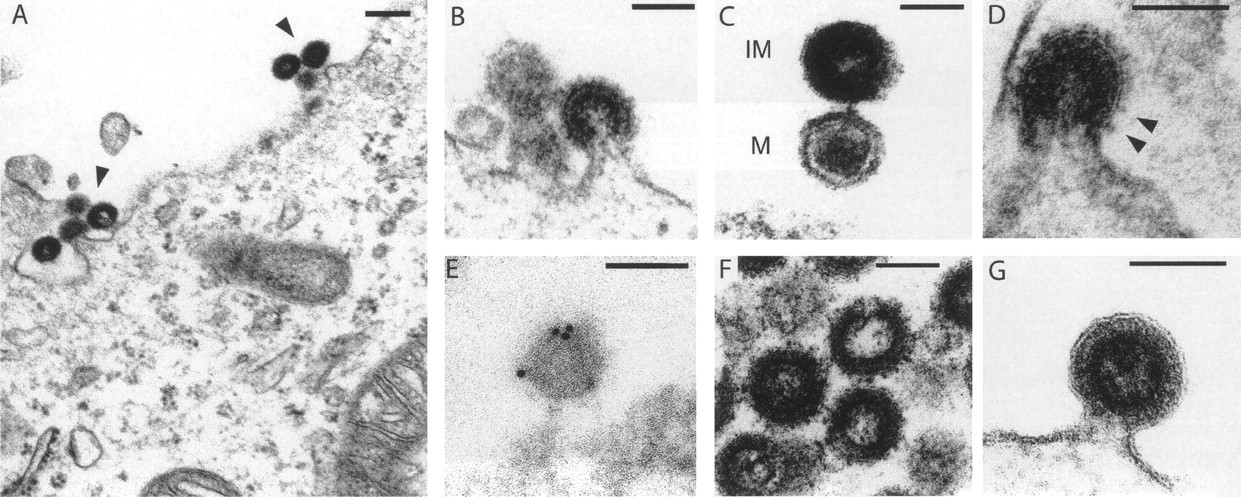 Electron microscopy of the viral-like particles generated by the Phoenix provirus. Human 293T cells were transfected with an expression vector for Phoenix (A–E), or mutants (F,G), and observed 48 h post-transfection. (A) Low magnification of particles assembled at the cell membrane. (B) Representative image of particles budding from the plasma membrane. (C) High magnification of two particles, one of which (bottom) discloses a mature (M) morphology with a condensed core, while the other appears to be still immature (IM) with two dark peripheral rings surrounding an electron-lucent core. (D) High magnification of a particle with prominent spikes, corresponding to the Env protein. (E) Image of a particle after labeling with an antibody specific for the HERV-K envelope protein and a secondary antibody linked to gold beads, obtained by immuno-electron microscopy. Quantification of the labeling on 11 independent fields demonstrates association of the gold beads with the viral particles: 307 ± 121 gold beads/μm2 for the viral particles, versus 4.9 ± 3.2 and 1.1 ± 1.5 gold beads/μm2 for the cytoplasm and particle-free extracellular space, respectively (P < 0.001 between viral particles and any of the two other compartments, Student’s t-test). (F) Image of representative particles obtained after transfection with an expression vector for the Phoenix pro mutant. All of them disclosed an immature morphology (41 of 41 identified “free” particles, i.e., no more in the budding process, for the pro mutant, vs. 15 of 37 for Phoenix WT). (G) High magnification of a particle obtained after transfection with an expression vector for the Phoenix env mutant. The membrane surrounding the particle is clearly detectable, without any spike. Scale bars: (A): 200 nm, (B–G):100 nm.