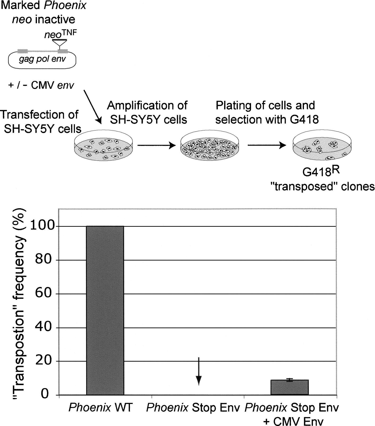 Assay for Phoenix “retrotransposition.” (Top) Rationale of the assay. Phoenix was marked with the neoTNF indicator gene for retrotransposition (Esnault et al. 2002), in which neo becomes active only after a complete retrotransposition cycle (i.e., transcription, reverse transcription, and integration), and the marked element was introduced by transfection into SH-SY5Y human cells permissive for Phoenix infection. The cells were then amplified and subjected to G418 selection for 2 wk; the number of G418R clones (several of which were assayed by PCR to demonstrate splicing out of the intron within the neo indicator gene) yielded the frequency of retrotransposition of the marked elements. (Bottom) “Retrotransposition” is dependent on the presence of a functional env gene, either present within the native Phoenix provirus (Phoenix WT) or added in trans to an env-mutated Phoenix provirus (Phoenix Stop Env) by cotransfection of the cells with an env expression vector (CMV Env). The results presented here correspond to three independent experiments, performed with 5–10 × 106 cells, and are given as relative transposition frequencies as compared to neoTNF-marked Phoenix (whose transposition frequency is 2 × 10−5 clone/seeded cell under these conditions).