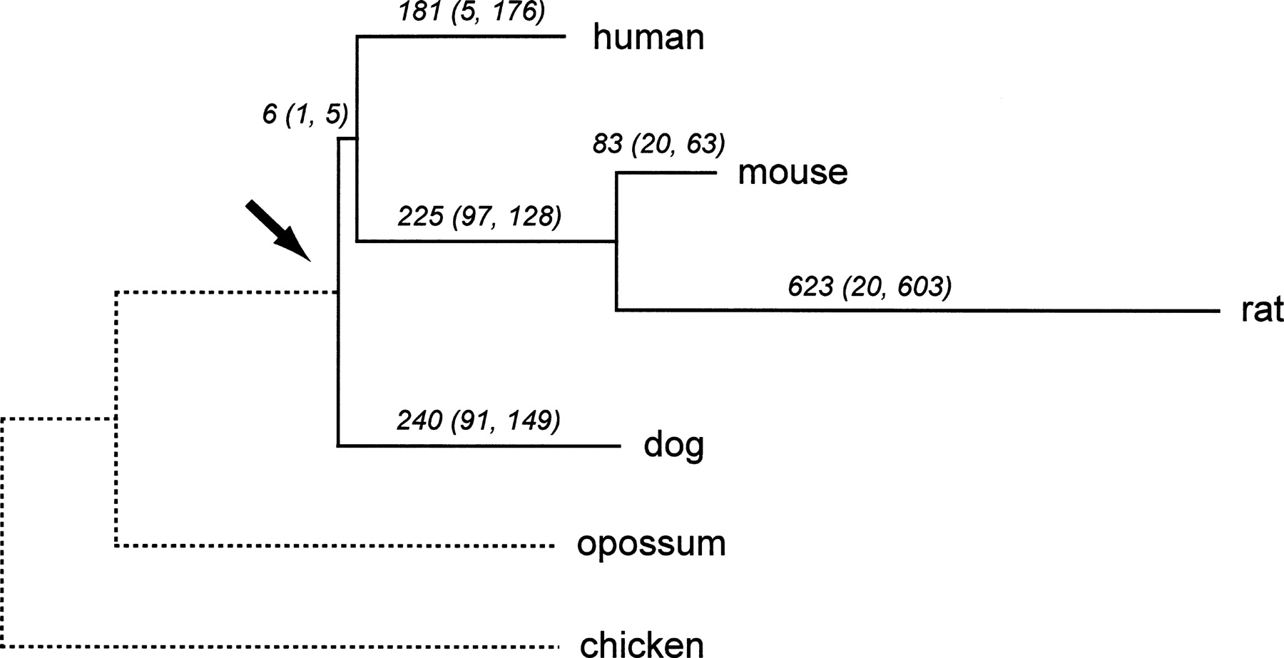 Position of the Boreoeutherian ancestor. Branch labels give the estimated number of chromosomal breaks from our study, also categorized as (interchromosomal, intrachromosomal). If conserved segments i and j are adjacent in the ancestral genome but not in the descendant genome, then we call the break interchromosomal if i and j are on different chromosomes in the descendant, and intrachromosomal otherwise. We suspect that many of the predicted intrachromosomal breaks in rat are assembly artifacts.