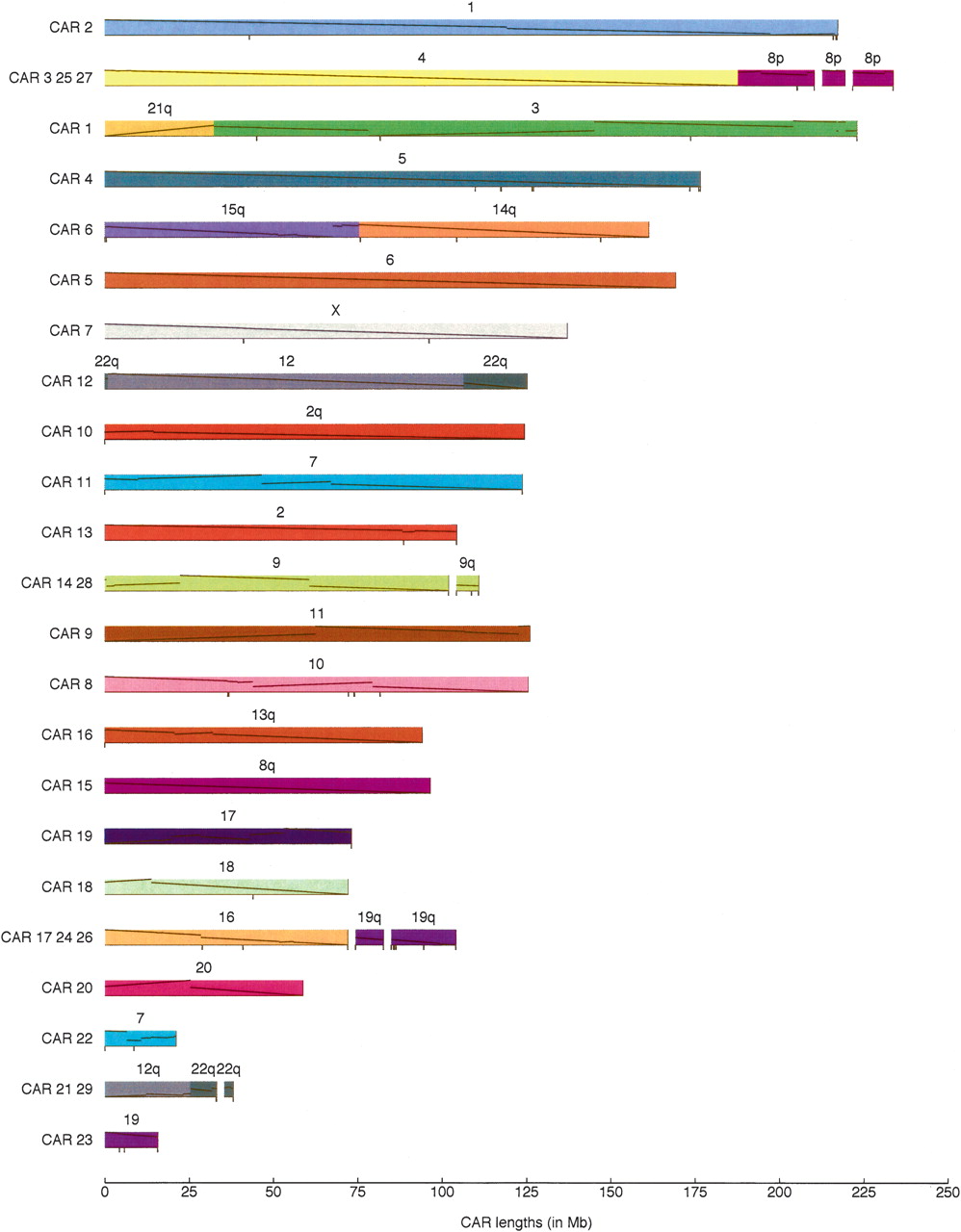 Map of the Boreoeutherian ancestral genome. For lengths of each CAR and corresponding parts in mouse, rat, and dog, see Table 2. Numbers above bars indicate the corresponding human chromosomes. Black tick marks below the bars indicate ambiguous joins (Fig. 7 in Methods; for details, see Supplemental material). Our predicted CARs are colored and ordered to facilitate comparison with Froenicke et al. (2006). Gaps between CARs are joins suggested by Froenicke et al. (2006). Diagonal lines within each block show the orientation and position in the human chromosome (Bourque et al. 2006).