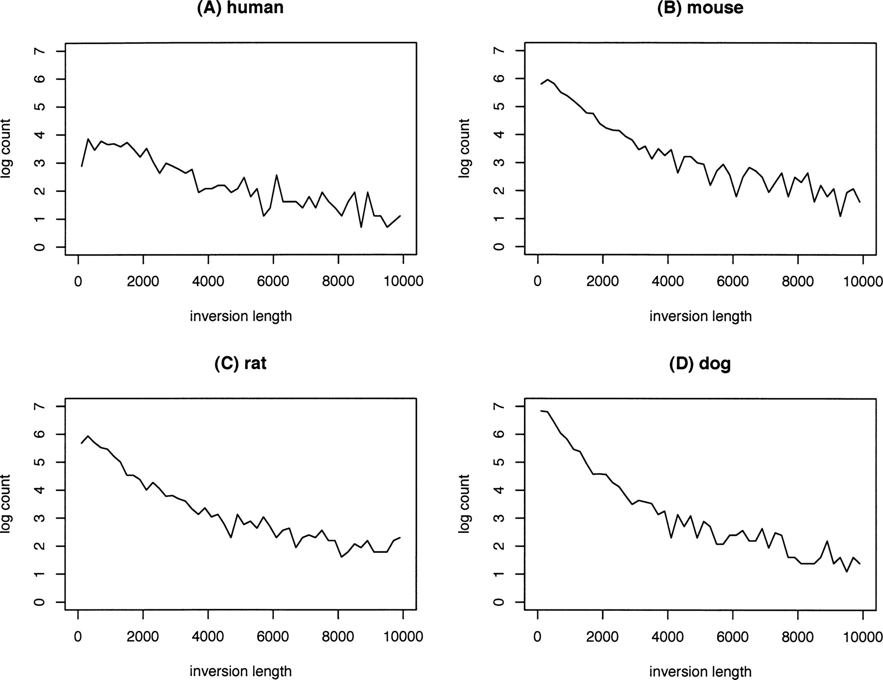 Length distribution of predicted inversions in human (A), mouse (B), rat (C), and dog (D). Inversions of lengths >10 kb are not represented in the plots. Inversions lengths are grouped into bins of 250 bp.