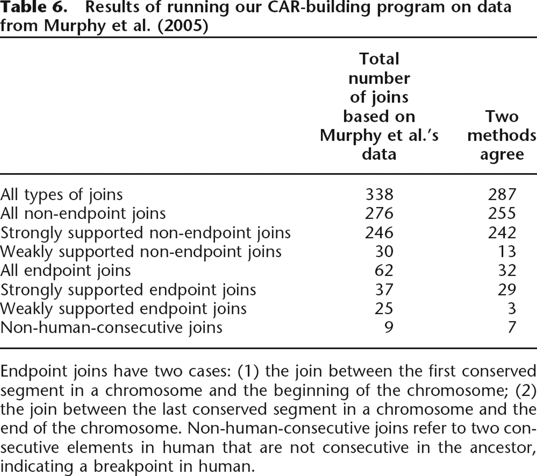Endpoint joins have two cases: (1) the join between the first conserved segment in a chromosome and the beginning of the chromosome; (2) the join between the last conserved segment in a chromosome and the end of the chromosome. Non-human-consecutive joins refer to two consecutive elements in human that are not consecutive in the ancestor, indicating a breakpoint in human.