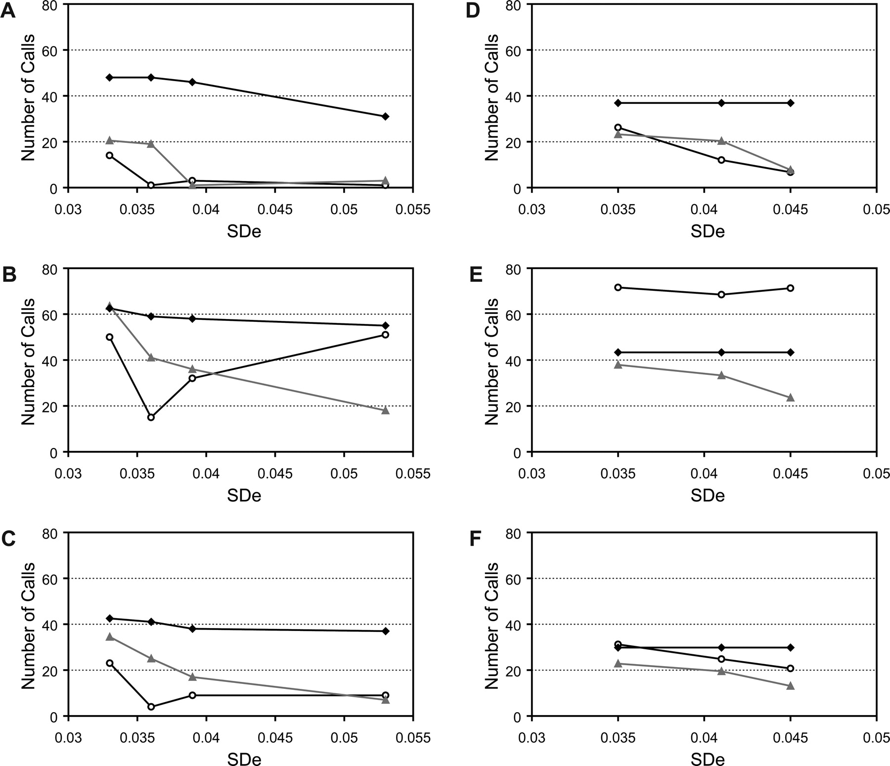 Comparison of CNVfinder with SW-ARRAY. CNV calling using CNVfinder (A), SW-ARRAY-permissive (B), and SW-ARRAY-stringent (C) in five replicate experiments. The number of regions called in three or four replicates (black diamonds), one or two replicates (gray triangles), or in none (white circles) of the other replicates is plotted against global SDe values. (D,E,F) CNV calling using CNVfinder (D), SW-ARRAY-permissive (E), and SW-ARRAY-stringent (F) in triplicate experiments of 10 different cell line DNAs. The replicate experiments were pooled into three different sets X, Y, and Z (see Table 3). The number of regions called in the two other replicates (black diamonds), one other replicate (gray triangles), or in none (white circles) is then plotted against the average of the global SDe values for each set.
