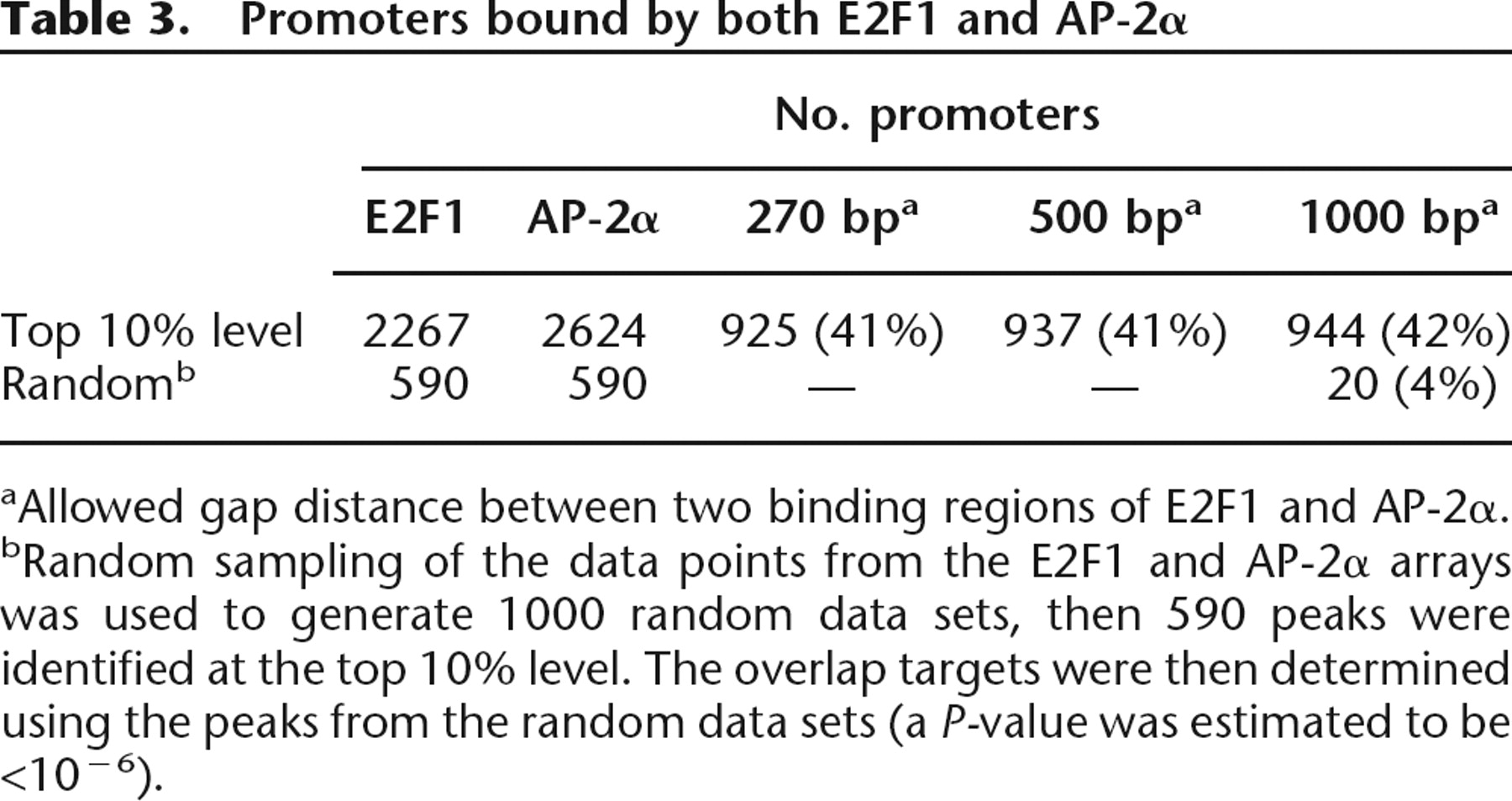 bRandom sampling of the data points from the E2F1 and AP-2α arrays was used to generate 1000 random data sets, then 590 peaks were identified at the top 10% level. The overlap targets were then determined using the peaks from the random data sets (a P-value was estimated to be <10−6).