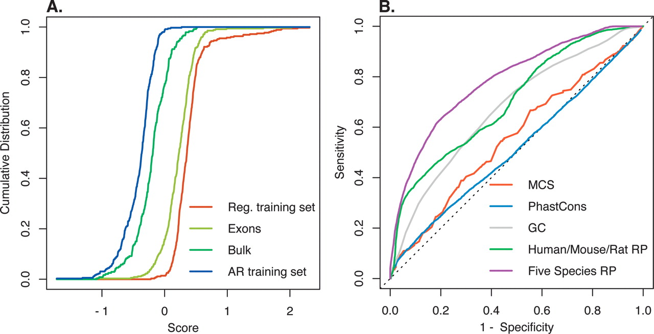 RP score performance demonstrated by cumulative distributions of scores on various genomic elements (A) and ROC plots for discrimination of 23 elements in the human β-globin locus (B).